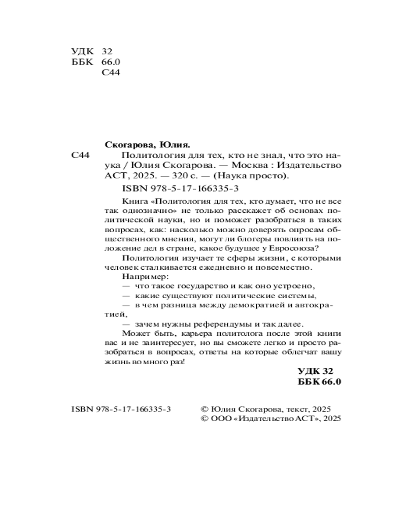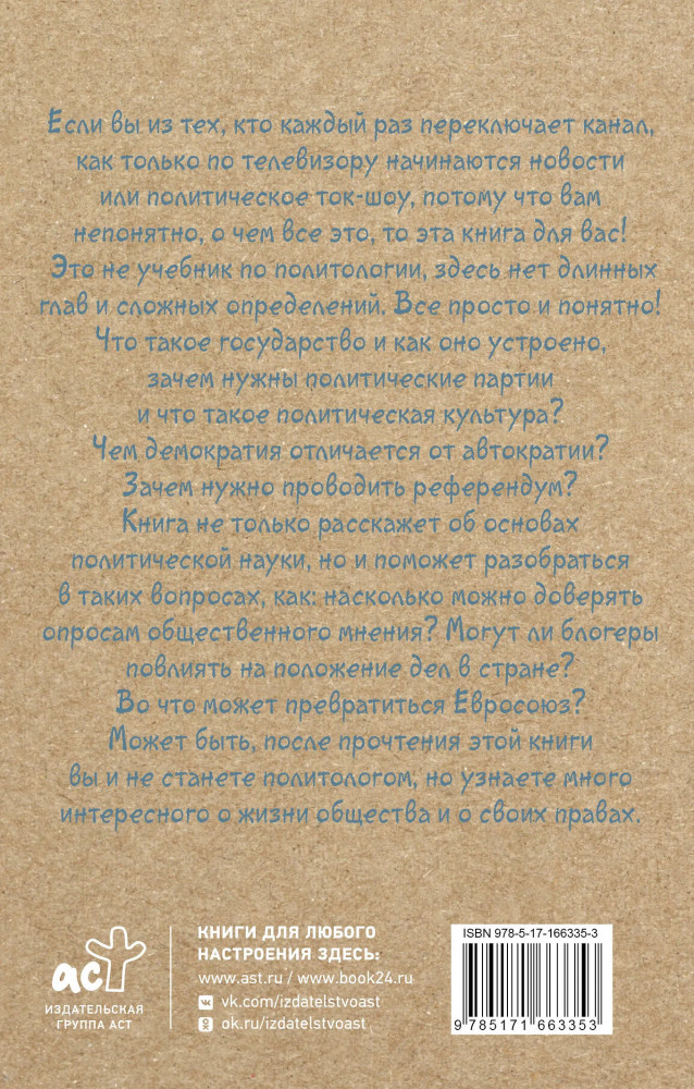 Серия: Наука просто Если вы из тех, кто каждый раз переключает канал, как только по телевизору начинаются новости или политическое ток-шоу, потому что вам непонятно, о чём всё это, то эта книга для вас! Это не учебник по политологии, здесь нет длинных глав и сложных определений. Все просто и понятно! Что такое государство и как оно устроено, зачем нужны политические партии и что такое политическая культура? Чем демократия отличается от автократии? Зачем нужно проводить референдум? Книга не только расскажет об основах политической науки, но и поможет разобраться в таких вопросах, как: насколько можно доверять опросам общественного мнения, могут ли блогеры повлиять на положение дел в стране, во что может превратиться Евросоюз? Может быть, после прочтения этой книги вы и не станете политологом, но узнаете много интересного о жизни общества и о своих правах. |