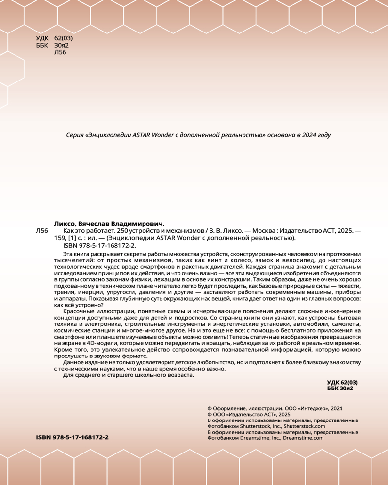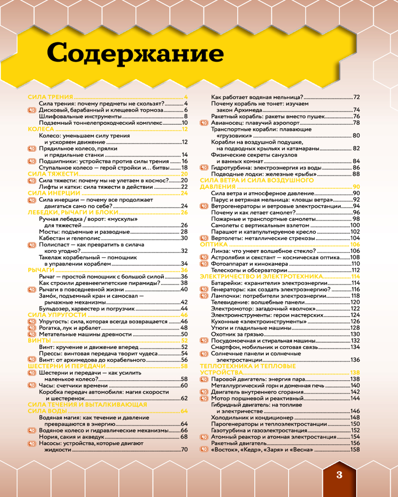 Серия: Энциклопедии ASTAR Wonder с дополненной реальностью Эта книга раскрывает секреты работы множества устройств, сконструированных человеком на протяжении тысячелетий: от простых механизмов, таких как винт и колесо, замок и велосипед, до настоящих технологических чудес вроде смартфонов и ракетных двигателей. Каждая страница знакомит с детальным исследованием принципов их действия, и что очень важно — все эти выдающиеся изобретения объединяются в группы согласно законам физики, лежащим в основе их конструкции. Таким образом, даже не очень хорошо подкованному в техническом плане читателю легко будет проследить, как базовые природные силы — тяжести, трения, инерции, упругости, давления и другие — заставляют работать современные машины, приборы и аппараты. Показывая глубинную суть окружающих нас вещей, книга дает ответ на один из главных вопросов: как всё устроено? |