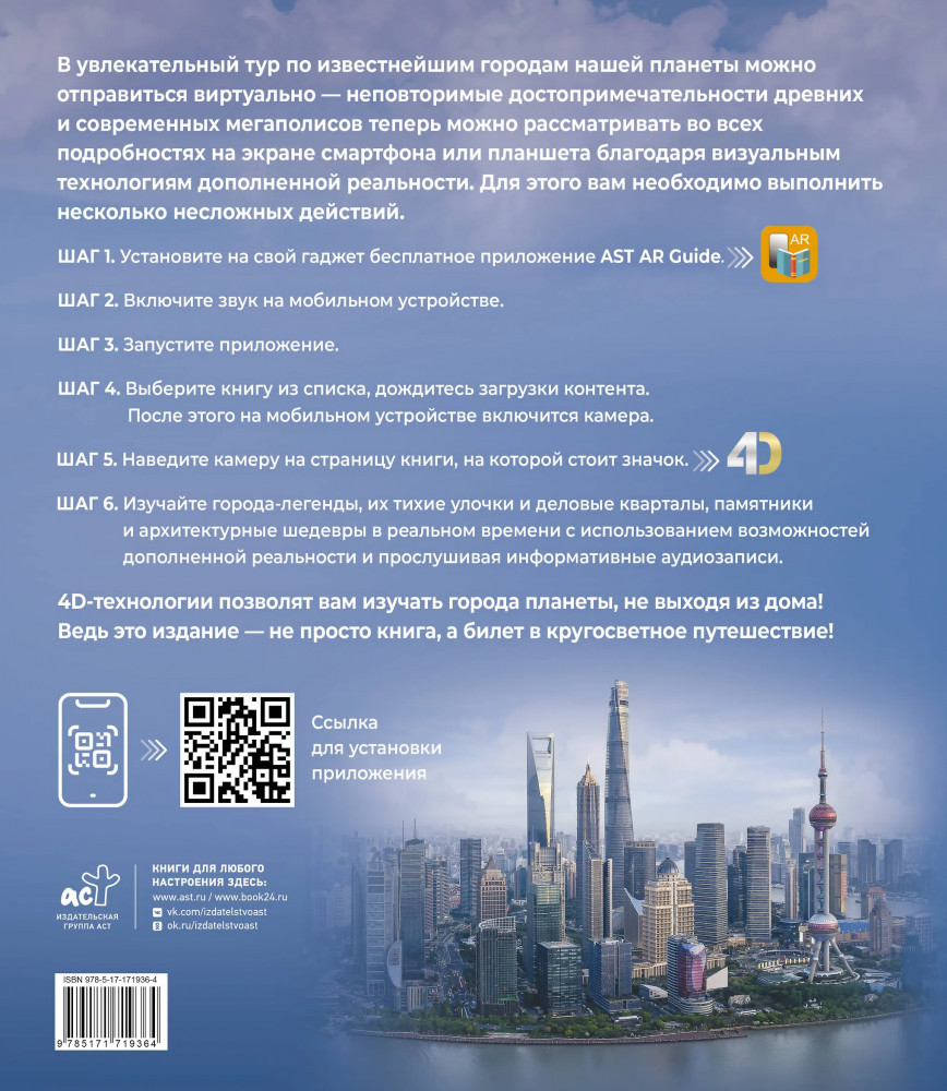Серия: Атлас с дополненной реальностью Перед вами «Атлас самых красивых городов мира с дополненной реальностью» — визуальный путеводитель по крупнейшим и интереснейшим городам, расположенным на всех континентах нашей планеты. В нем рассказывается об истории, достопримечательностях, современной жизни и уникальных особенностях наиболее значимых городов мира. Листая его страницы, вы пройдетесь по бульварам Парижа, заглянете в узкие переулки Флоренции, услышите шум улиц Нью-Йорка, почувствуете тысячелетнее дыхание построек Афин и познакомитесь со многими другими городами. А благодаря эффекту дополненной реальности изучение древних и современных мегаполисов может превратиться для вас в увлекательное приключение, ведь в этой книге яркие иллюстрации, масштабные и панорамные фотоснимки представлены с помощью новейших технологий, позволяющих читателям «оживить» страницы через специальное мобильное приложение. |