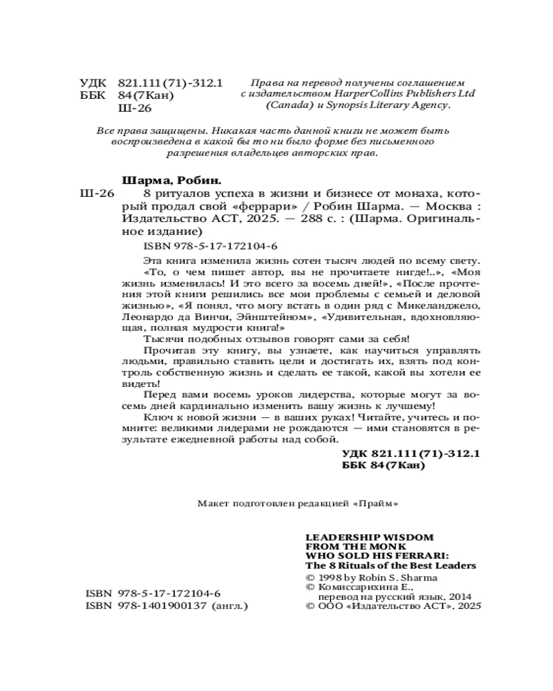 Серия: Шарма. Оригинальное издание Эта книга изменила жизнь сотен тысяч людей по всему свету.