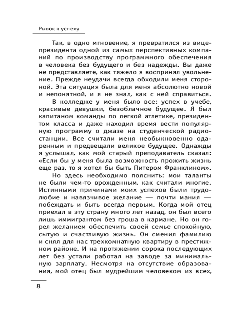 Перед вами восемь уроков лидерства, которые могут за восемь дней кардинально изменить вашу жизнь к лучшему! Ключ к новой жизни — в ваших руках! Читайте, учитесь и помните: великими лидерами не рождаются — ими становятся в результате ежедневной работы над собой. |