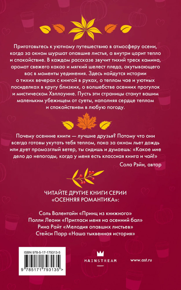 💳 Оплатить за товар можно при получении 🇰🇿 Есть бесплатная доставка по Казахстану от 1 дня 🎁 Копите бонусы с каждой покупки Серия: Осенняя романтика Приготовьтесь к уютному путешествию в атмосферу осени, когда за окном шуршат опавшие листья, а внутри царит тепло и спокойствие. В каждом рассказе звучит тихий треск камина, аромат свежего какао и мягкий шелест пледа, окутывающего вас в моменты уединения. |