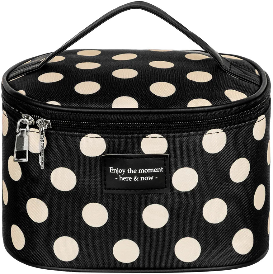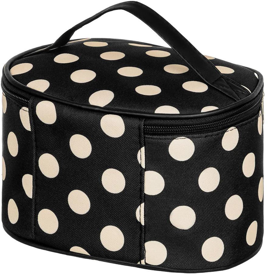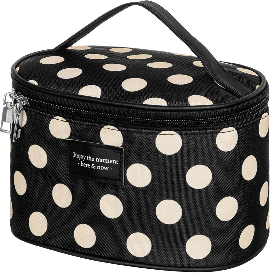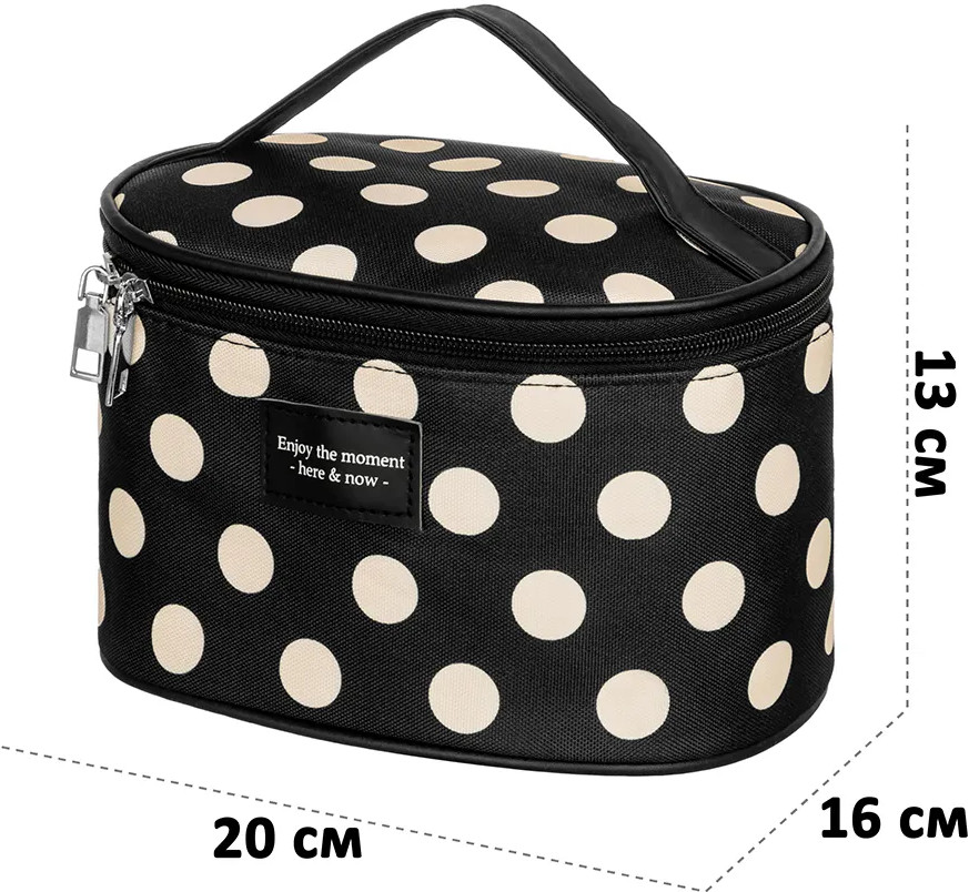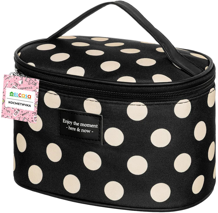 Благодаря стильному чёрному дизайну в белый горошек косметичку можно хранить даже на видном месте, например, на полке или вешалке. Она гармонично дополнит любой интерьер! Прочная ручка обеспечит удобство при переноске, поэтому изделие выступит в роли практичной походной сумки. Возьмите её с собой в путешествие или поездку для перевозки разнообразных мелочей. Она послужит в роли дорожной аптечки для удобной транспортировки лекарств. Это не только оригинальный, но и функциональный подарок как для девочки, так и для женщины. Не рекомендуется применять абразивные моющие средства. В коллекции бренда El Casa вы найдет большой ассортимент товаров для дома, которые помогут вам организовать бережную систему хранения ваших вещей!