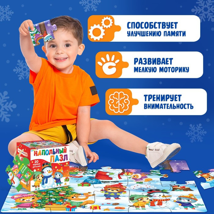 Напольный пазл с новогодним сюжетом — то, что нужно для полезного и интересного досуга! Такой подарок поможет ребёнку скрасить ожидание Нового года, а необычные крупные элементы и красочные иллюстрации заинтересуют малыша. Малыш соберёт все 20 деталей в одно целое и получит красочный пазл с новогодним сюжетом. Размер собранной картинки: 55×44 см. Детали выполнены из картона. Размер одной детали: 13.5×12 см. Занимаясь с напольными пазлами, ребёнок научится находить связь между частью и целым, потренирует сенсорные навыки, координацию движений, внимание и логическое мышление. |