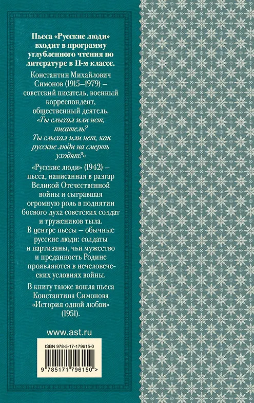 Серия: Классика для школьников Пьеса «Русские люди» входит в программу углубленного чтения по литературе в 11-м классе. Константин Михайлович Симонов (1915-1979) — советский писатель, военный корреспондент, общественный деятель. «Ты слыхал или нет, писатель? Ты слыхал или нет, как русские люди на смерть уходят?» «Русские люди» (1942) — пьеса, написанная в разгар Великой Отечественной войны, и сыгравшая огромную роль в поднятии боевого духа советских солдат и тружеников тыла. В центре пьесы — обычные «русские люди»: солдаты и партизаны, чьи мужество и преданность Родине проявляются в нечеловеческих условиях войны. В книгу также вошла пьеса К. Симонова «История одной любви» (1951). |