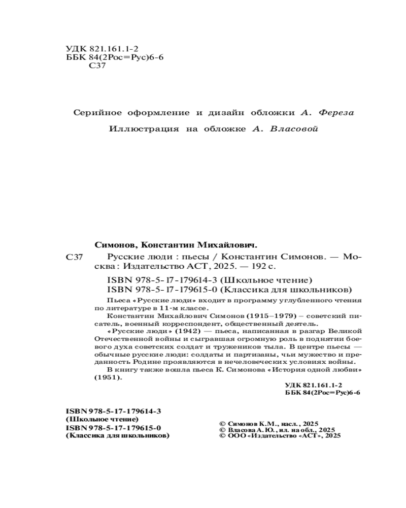 Серия: Школьное чтение Пьеса «Русские люди» входит в программу углубленного чтения по литературе в 11-м классе. Константин Михайлович Симонов (1915-1979) — советский писатель, военный корреспондент, общественный деятель. «Ты слыхал или нет, писатель? Ты слыхал или нет, как русские люди на смерть уходят?» «Русские люди» (1942) — пьеса, написанная в разгар Великой Отечественной войны, и сыгравшая огромную роль в поднятии боевого духа советских солдат и тружеников тыла. В центре пьесы — обычные «русские люди»: солдаты и партизаны, чьи мужество и преданность Родине проявляются в нечеловеческих условиях войны. В книгу также вошла пьеса К. Симонова «История одной любви» (1951). |