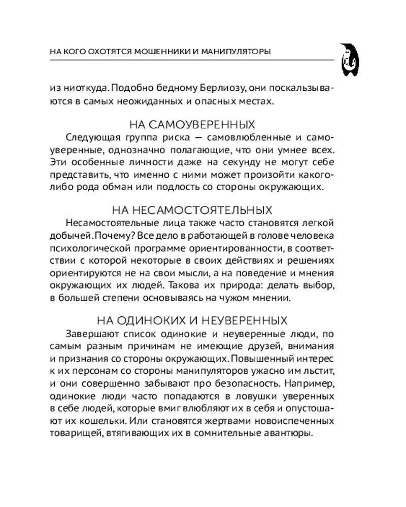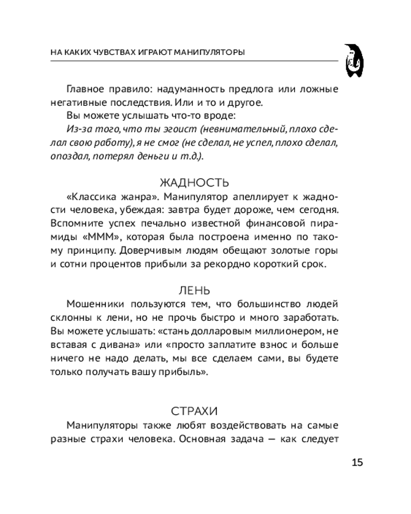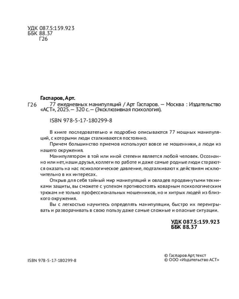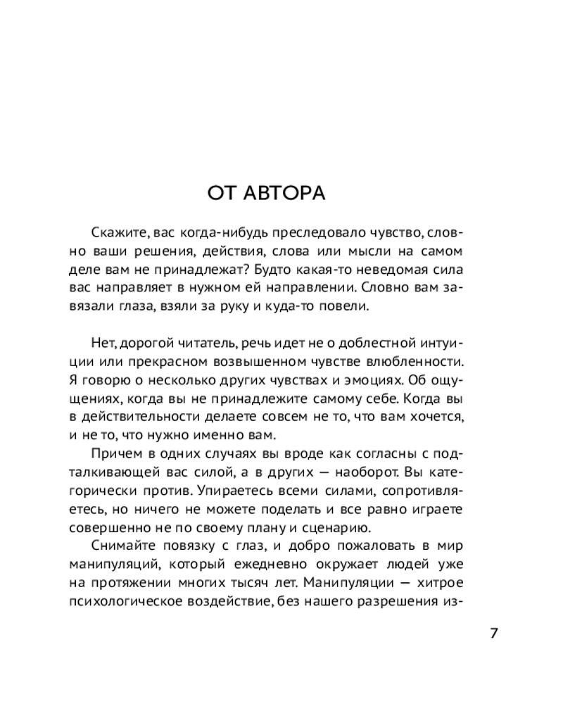 Серия: Эксклюзивная психология В книге последовательно и подробно описываются 77 мощных манипуляций, с которыми люди сталкиваются постоянно. Причем большинство приемов используют вовсе не мошенники, а люди из нашего окружения. Манипулятором в той или иной степени является любой человек. Осознанно или нет, наши друзья, коллеги по работе и даже самые родные люди стараются оказать на нас психологическое давление, подталкивают к действиям исключительно в их интересах. |
