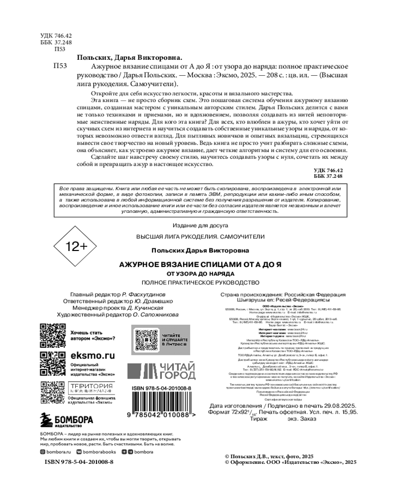 Серия: Высшая лига рукоделия. Самоучители Хватит вязать по скучным схемам из интернета! С этой книгой вы научитесь создавать собственные ажурные узоры и превращать их в стильные вещи, от которых невозможно отвести взгляд. В книге ажуры рассматриваются не как декоративный элемент, а как полноценная основа стильной, носибельной одежды. Вы научитесь понимать, а не просто вывязывать схемы, получите систему, с которой сможете сами создавать любые ажуры под свои проекты. Ваши вещи станут не просто красивыми — они будут вызывать восторг! Каждая ваша вещь будет рассказывать свою историю. А вы — ее автор. |
