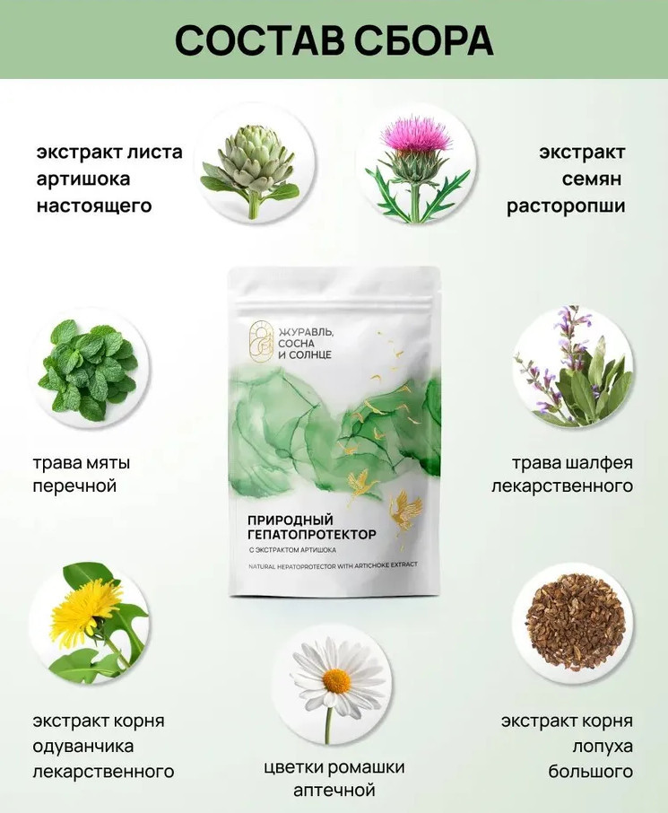 Травы, входящие в состав:Артишок обладает желчегонным эффектом. Стимулирует отток желчи, препятствует образованию камней в желчном пузыре. Способствует детоксу (очищению) — ускоряет выведение токсинов, мочевины и солей тяжелых металлов.Расторопша (она же силимарин или чертополох молочный) — очищает и восстанавливает печень. Защищает от последствий употребления лекарств (антибиотиков) и развития атеросклероза.Корень лопуха имеет мочегонное действие, улучшает обмен веществ в организме.Мята перечная снимает спазмы, помогает выздоровлению. В комплекс входят также ромашка аптечная, шалфей лекарственный и одуванчик.Сбор следует принимать в дополнение к основному лечению и назначенным препаратам при гепатитах, циррозе, жировом гепатозе, заболеваниях ЖКТ и поджелудочной железы, а также при повышенном холестерине.