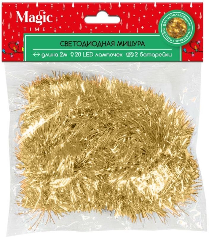 Светодиодная гирлянда в золотой мишуре. Длина гирлянды составляет 2 метра, она оснащена 20 LED лампочками, которые работают от двух батареек. Гирлянда предназначена для использования в помещении, что идеально подходит для украшения дома или праздничного декора. Яркая золотая мишура создаёт праздничную атмосферу, а светодиоды придают украшению волшебное сияние. Упакована в прозрачный пакет с ярким красным фоном, что добавляет товару праздничного настроения. |