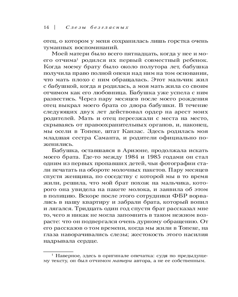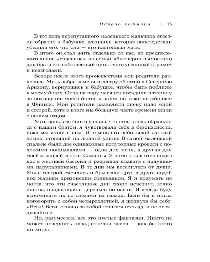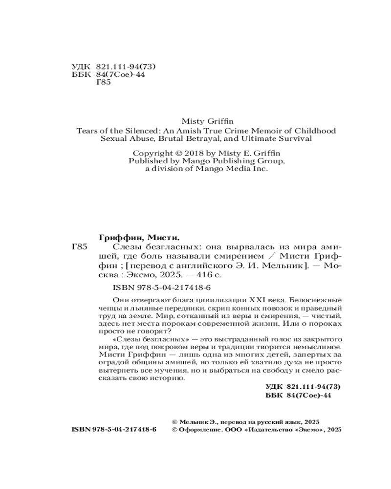 Серия: Замок из стекла. Книги о сильных людях и удивительных судьбах Мисти с детства привыкла молчать и бояться. После страшных лет жизни с жестокими матерью и отчимом она попала в общину амишей. Белоснежные чепцы и льняные передники, скрип конных повозок и праведный труд на земле. Мир, сотканный из веры и смирения — чистый, здесь нет места порокам современной жизни и благам цивилизации XXI века. Или о пороках просто не говорят? |