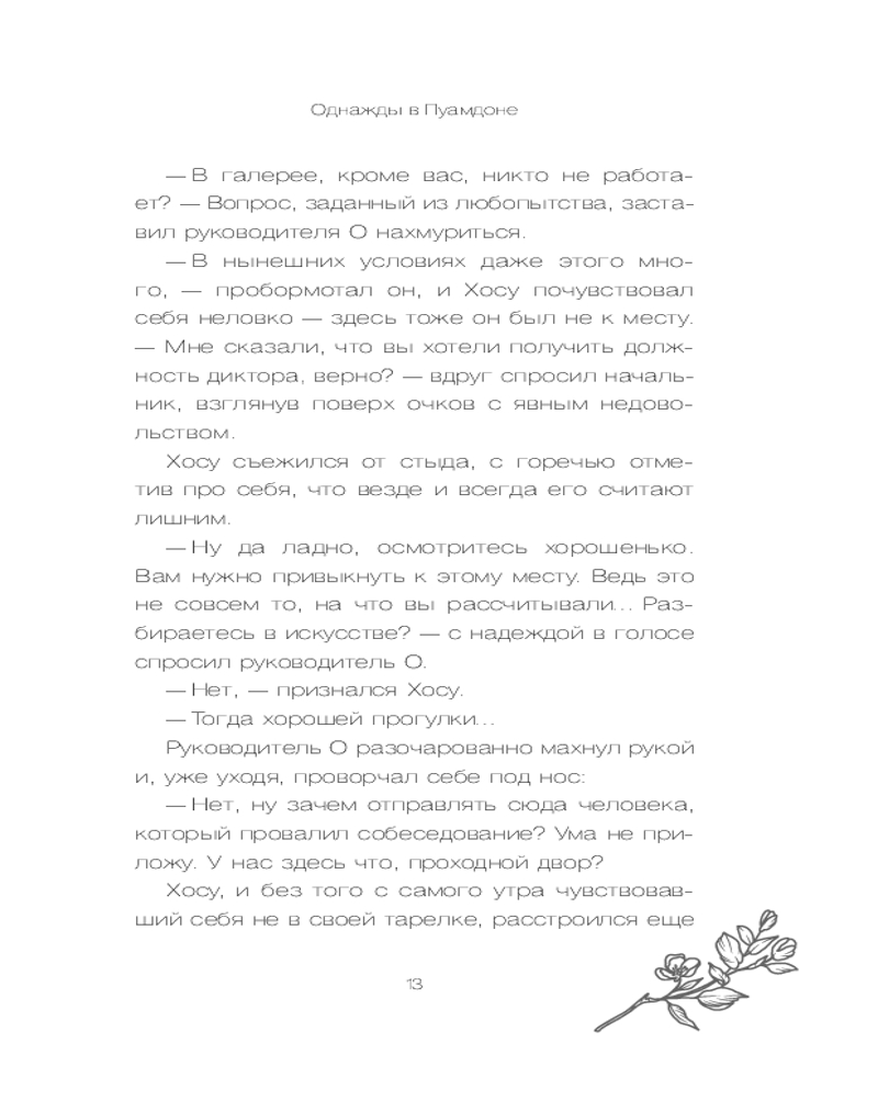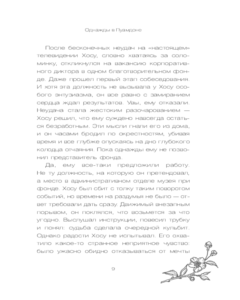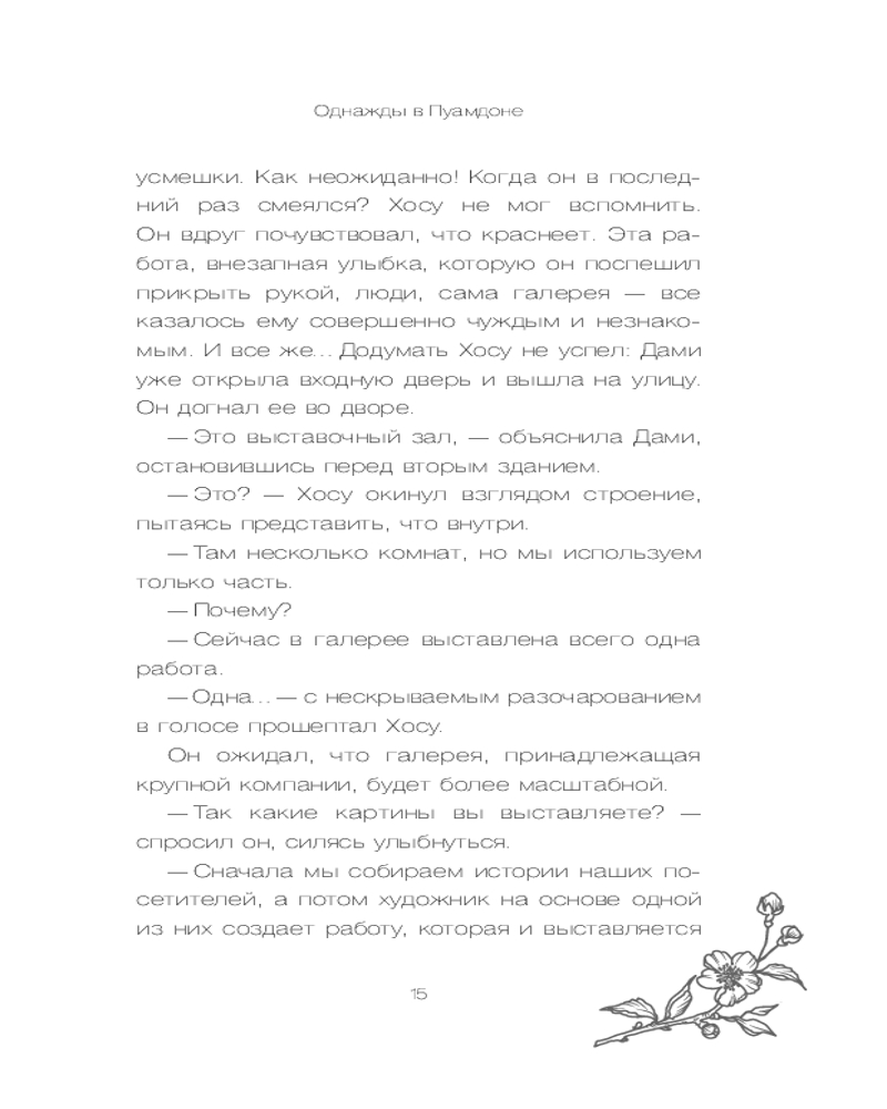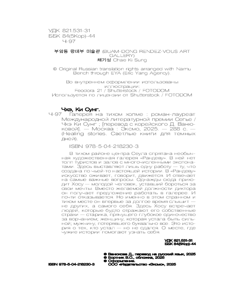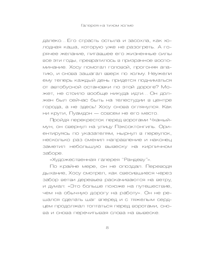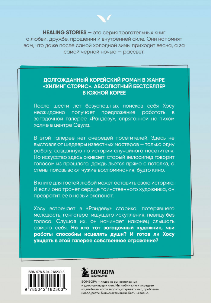 Серия: Healing stories. Светлые книги для темных дней После шести лет безуспешных поисков себя Хосу неожиданно получает предложение работать в загадочной галерее «Рандеву», спрятанной на тихом холме в центре Сеула. В этой галерее нет очередей посетителей. Здесь не выставляют шедевры известных мастеров — только одну работу, созданную по истории случайного посетителя. Но искусство здесь оживает: старый велосипед говорит голосом из прошлого, дождь льется прямо с потолка, а стены показывают чужие воспоминания, будто кино. |