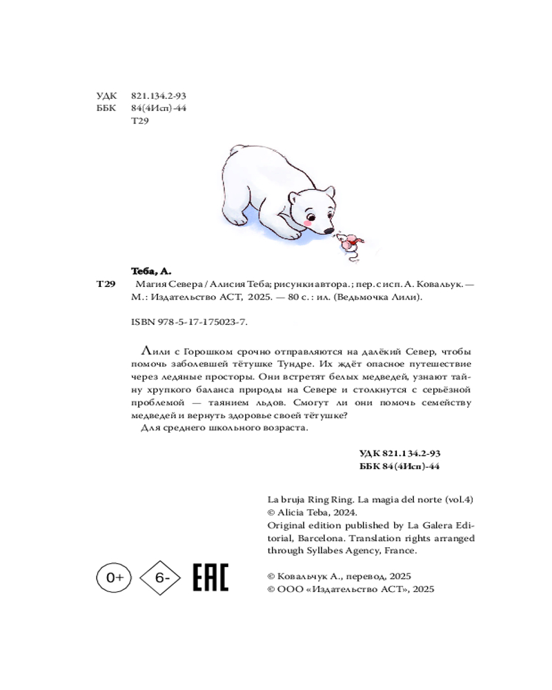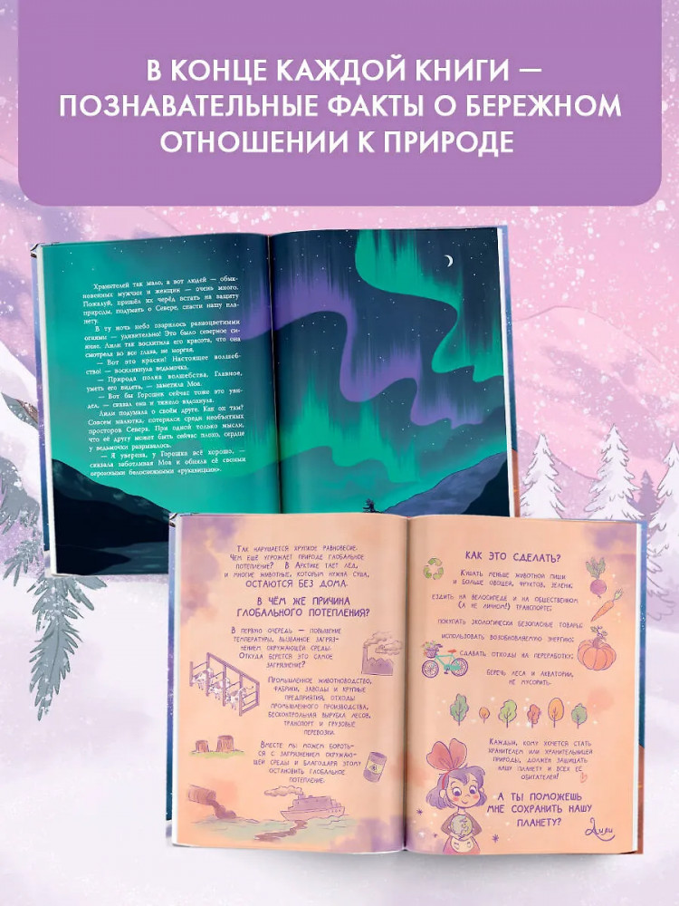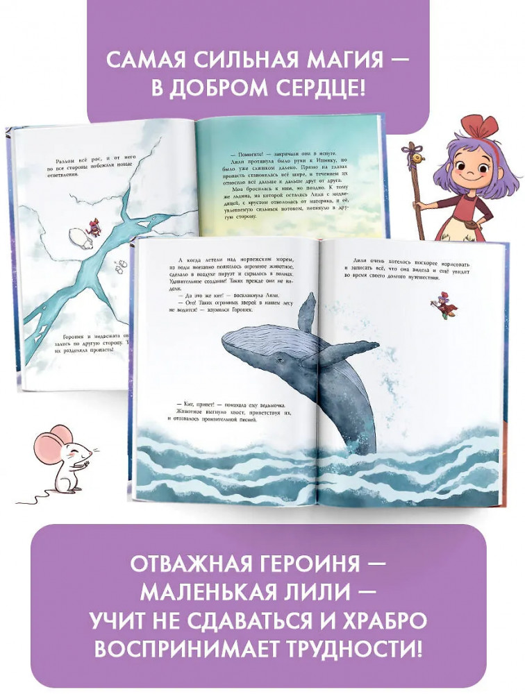 Серия: Ведьмочка Лили Уютная книга с прекрасными иллюстрациями для маленьких волшебниц и волшебников 5-8 лет. Редакция «Вилли Винки» представляет долгожданную новую историю о ведьмочке Лили! Любознательная Лили — внучка доброй ведьмы. Она понимает язык зверей, летает на метле и учится колдовать. «Самая сильная магия — в добром сердце!» — её девиз. На этот раз Лили с мышонком Горошком срочно отправляются на далёкий Север, чтобы помочь заболевшей тётушке Тундре. Их ждёт опасное путешествие через ледяные просторы. Они встретят белых медведей, узнают тайну хрупкого баланса природы на Севере и столкнутся с серьёзной проблемой — таянием льдов. Cмогут ли они помочь семейству медведей и вернуть здоровье своей тётушке? Добрые персонажи, щедрое иллюстрирование, волшебство и приключения: такая детская книга станет замечательным подарком ребёнку для первого самостоятельного чтения и семейного чтения на ночь! |