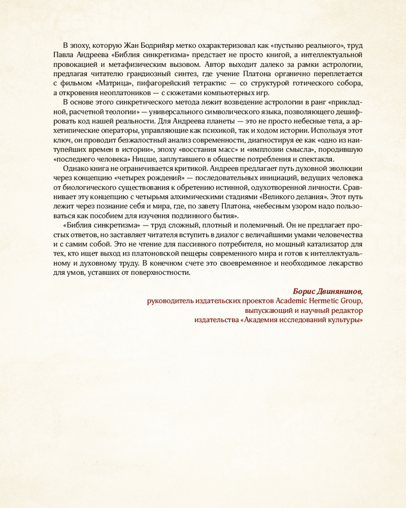 Библия синкретизма: за пределами астрологииВ данный момент этот товар отсутствует в продаже. Возможно, у нас найдется аналогичный или похожий товар здесь. Серия: Школа астрологии Павла Андреева: эксклюзив Павел Андреев — профессиональный астролог, исследователь, автор тематических книг, специалист по математическим методам прогноза. Занимается астрологией более 15 лет. За его плечами десятки консультаций, сотни часов исследований и тысячи измененных судеб. Сооснователь проекта «Лаборатория Жизни» — Высшей школы астрологии, где преподает и консультирует по своей авторской методике, которая уже много лет назад зарекомендовала себя как сильнейшая и невероятно эффективная. |