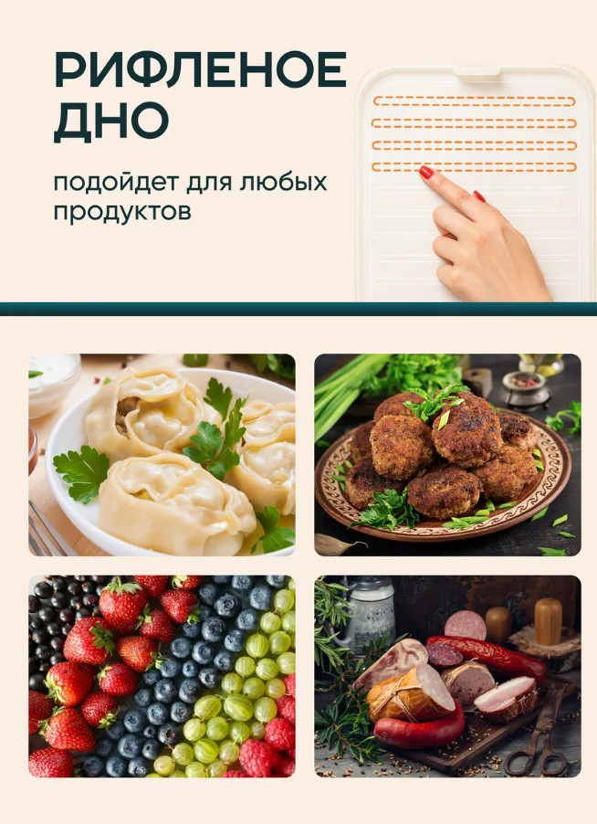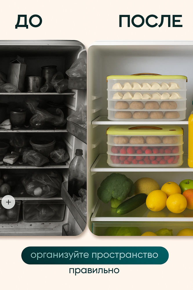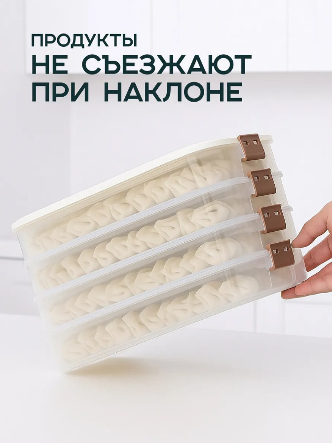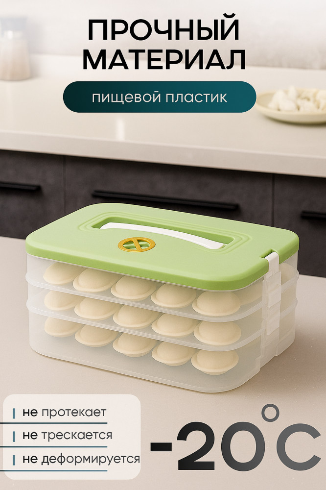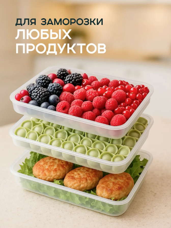 Контейнеры для заморозки пельменей — это удобное, практичное и безопасное решение для хранения заготовок и продуктов в холодильнике и морозильной камере. Такой набор для морозилки позволит аккуратно организовать пространство, сохранить свежесть еды, избежать неприятных запахов.Многоразовый контейнер для заморозки пельменей состоит из 4 вместительных секций и 1 герметичной крышки. Каждая секция выполнена из качественного пищевого пластика и имеет рифлёное дно, предотвращающее прилипание и скольжение продуктов. Эти вместительные емкости для заморозки с крышкой имеют оптимальные размеры. Прозрачные стенки позволяют видеть содержимое, а встроенный даттер на крышке помогает установить дату заморозки, чтобы всегда контролировать свежесть продуктов.Контейнеры под заморозку универсальны,они подходят не только для пельменей, но и для хранения котлет, овощей, зелени, ягод и фруктов. Такой набор удобно использовать как для домашних заготовок, так и для готовых блюд. разделенные секции обеспечивают правильное хранение в морозильной камере: продукты не смешиваются, не впитывают запахи,сохраняют первоначальный вкус.Многоярусная емкость для заморозки пельменей компактно помещается в морозильник и помогает экономить место. Герметичные крышки надёжно защищают продукты.Прочные лотки для заморозки рассчитаны на многократное использование и легко моются вручную и в посудомоечной машине при щадящих режимах.