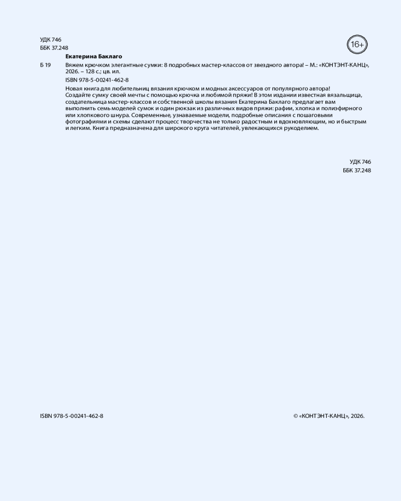 💳 Оплатить за товар можно при получении 🇰🇿 Есть бесплатная доставка по Казахстану от 1 дня 🎁 Копите бонусы с каждой покупки Новая книга для любительниц вязания крючком и модных аксессуаров от популярного автора! Создайте сумку своей мечты с помощью крючка и любимой пряжи! В этом издании известная вязальщица, создательница мастер-классов и собственной школы вязания Екатерина Баклаго предлагает вам выполнить семь моделей сумок и один рюкзак из различных видов пряжи: рафии, хлопка и полиэфирного или хлопкового шнура. Современные, узнаваемые модели, подробные описания с пошаговыми фотографиями и схемы сделают процесс творчества не только радостным и вдохновляющим, но и быстрым и легким. Книга предназначена для широкого круга читателей, увлекающихся рукоделием. |