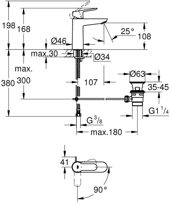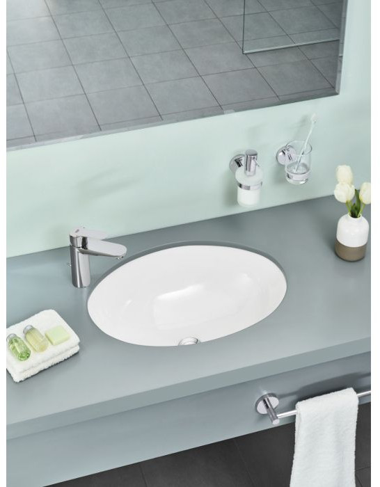 Благодаря технологии Grohe Water Saving, смеситель поддерживает оптимальный поток воды при уменьшенном расходе, не превышая 5 литров в минуту при давлении 3 бара. Система быстрого монтажа упрощает установку, а рычажный донный клапан размером 1 1/4″ и гибкая подводка делают подключение удобным и быстрым.