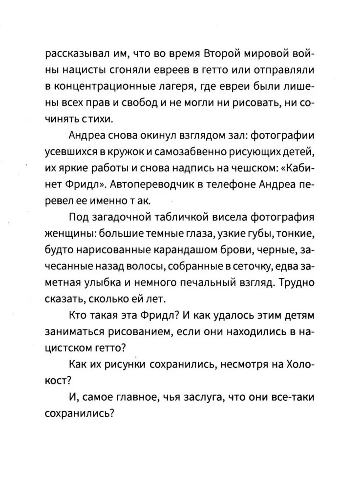 Может ли искусство спасать? Зачем оно в условиях неизбежной катастрофы? Венская художница Фридл Дикер-Брандейс (1898–1944), попав в 1942 году в Терезинское гетто, занималась рисованием с депортированными туда детьми, обреченными на смерть. Ведь из Терезина нацисты отправляли заключенных в Освенцим. Большинство маленьких учеников Фридл погибли в Холокосте. Но вместе с ней они рисовали жизнь, обретая в творчестве свободу и надежду. Фридл сумела собрать, надписать и спрятать 5 тысяч детских рисунков, многие из которых хранятся в Еврейском музее Праги. Фридл сохранила память о сотнях уничтоженных детей, а ее метод стал основой современной арт-терапии. |