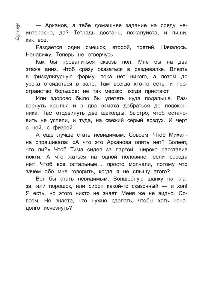 Пашка ненавидит школу. Одноклассники его не любят, учителя придираются и занижают оценки. Она вообще не замечает его существования. Дома тоже дела не очень: отец пропадает на работе, мама... скучная. Друг у него один, и тот — так себе. Да и сам Пашка, если честно, — просто дурында, как его когда-то назвал близкий человек. И теперь Пашка мечтает об одном: просто исчезнуть хотя бы на время. На один день. Чтобы никто его не беспокоил, не замечал... Стать невидимым. А что, если это возможно? Что, если один день может изменить все? Дополняют историю иллюстрации Леси Улановой.