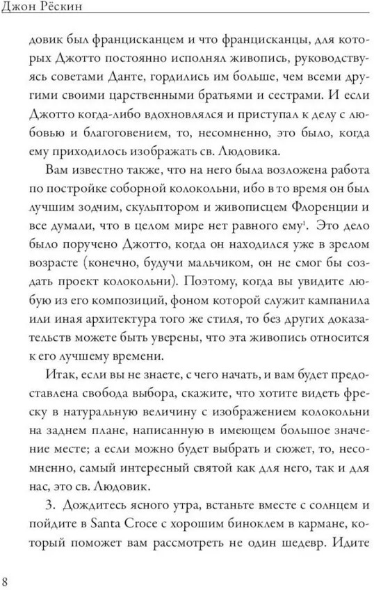 «Прогулки по Флоренции» написаны Джоном Рёскиным в 1877 году. Путеводитель по Флоренции, с ее, как позднее напишет И. Бродский «архитектурой рая», представляет собой не шесть глав -«шесть утр». «Дождитесь ясного утра, — пишет Рёскин, — встаньте вместе с солнцем и пойдите в Santa Croce с хорошим биноклем в кармане, который поможет вам рассмотреть не один шедевр». Сегодняшнему читателю не составит труда найти в интернете какое-либо большое произведение искусства Ренессанса в мельчайших подробностях, но чтобы проникнуть в его суть, необходим проводник. Эрудит, обаятельный рассказчик и поэт Рёскин проведет читателя по знаковым памятникам Флоренции, подскажет лучший ракурс для обзора, снабдит необходимыми цитатами из Данте, историческими фактами, а главное, пробудит в нем желание увлеченно исследовать искусство эпохи Возрождения.