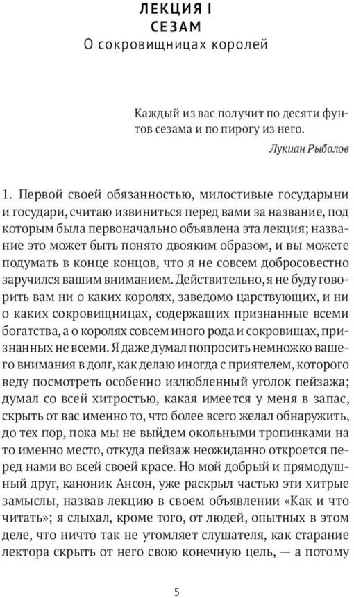 Сезам и лилии. Английский писатель, художник, философ и теоретик искусства Джон Рёскин (1819–1900) был одним из первых, кто на заре развития искусствознания предложил новый взгляд на природу и сущность художественного творчества, показав его глубокую взаимосвязь со всей человеческой культурой. Эта эстетическая программа получила непосредственное выражение в цикле лекций, составивших книгу «Сезам и лилии». Опираясь на классические произведения Данте, Мильтона, Шекспира, автор рассуждает о губительном материализме современного ему общества, необходимости воспитания чувства прекрасного, неразрывно сопряженного с этикой, а также о важнейшей роли женщин в этом процессе.