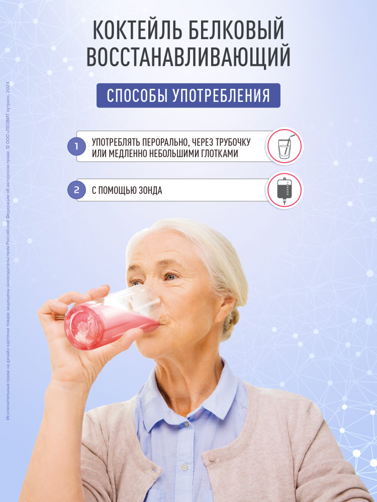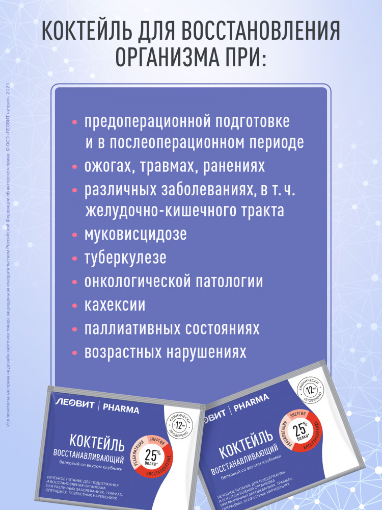 Коктейль белковый восстанавливающий — это специализированный пищевой продукт диетического лечебного и диетического профилактического питания, в т.ч. для энтерального питания (зондового и перорального использования), для восстановления организма, для детей старше 12 лет и взрослых, с высокими потребностями в белке и энергии, при различных заболеваниях, в т.ч. при ожогах, травмах, заболеваниях желудочно-кишечного тракта, при онкологической патологии, муковисцидозе, туберкулезе, паллиативных состояниях, возрастных нарушениях, кахексии; в пред- и послеоперационном периоде; в период и после химио- и лучевой терапии; в период реабилитации. Подходит для восстановления ЖКТ, а также для послеоперационного питания.