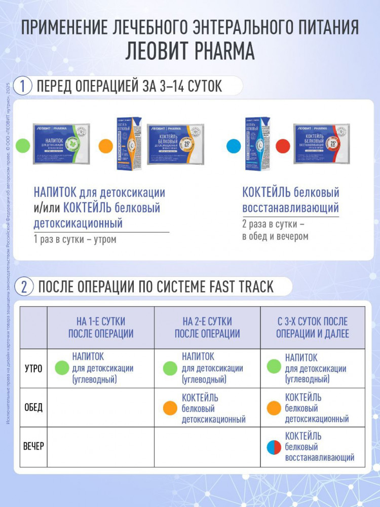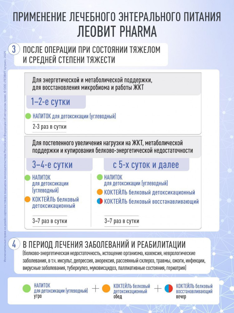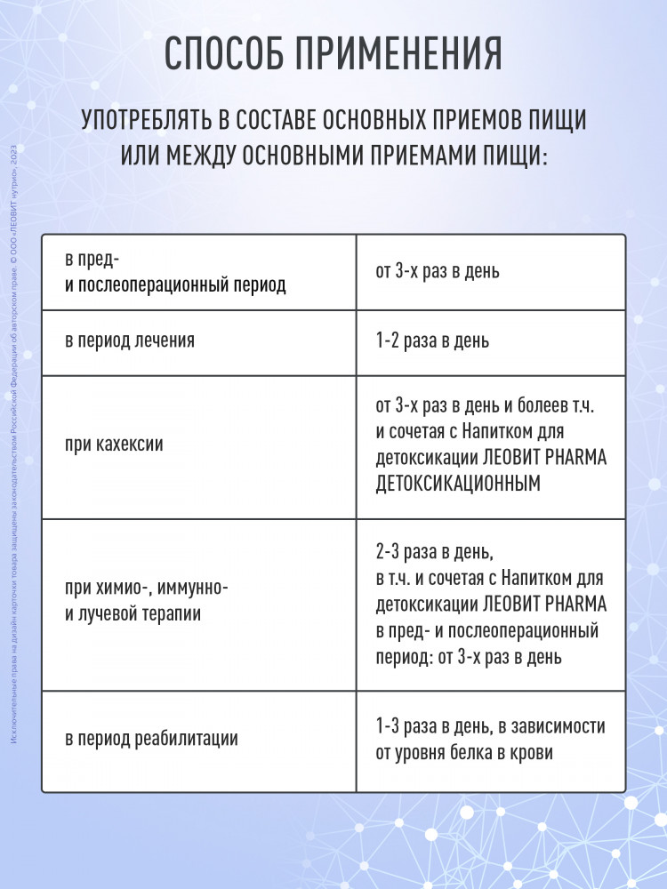 • при кахексии — от 3 раз в день и более, в т.ч. сочетая с напитком для детоксикации ЛЕОВИТ PHARMA;