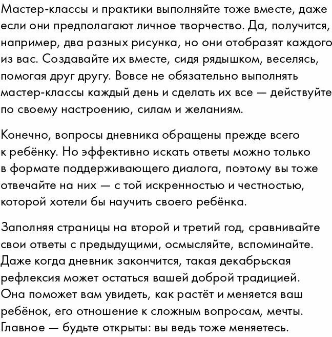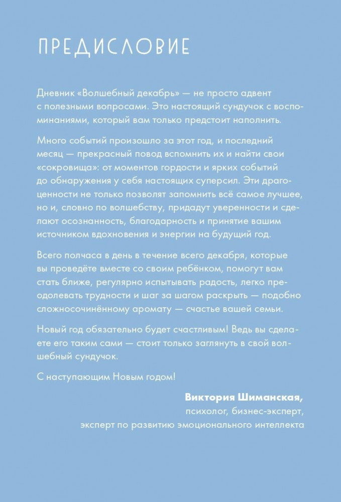 Дневник «Волшебный декабрь» создан специально для мам. Это настоящий сундучок с сокровищами — тёплыми воспоминаниями о взрослении ребёнка. Он рассчитан на 3 года и содержит 31 вопрос для обсуждения, а также творческие задания, которые помогут скоротать декабрь в ожидании праздника. Заполняя дневник каждый год вместе с ребёнком, вы сможете видеть, как он развивается, как меняются его взгляды и вкусы, начнете лучше понимать его чувства, мысли и интересы. Потратьте всего полчаса в день, растягивая удовольствие и заполняя дневник в течение месяца, или же возьмитесь за него в канун праздника и скоротайте с ним целый счастливый и уютный день. Какой бы способ вы ни выбрали, это время, которое вы проведете вместе со своим ребенком, поможет вам стать ближе, испытать много радости, научиться легко преодолевать трудности и стать по-настоящему счастливой семьей. |