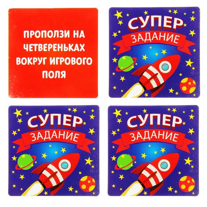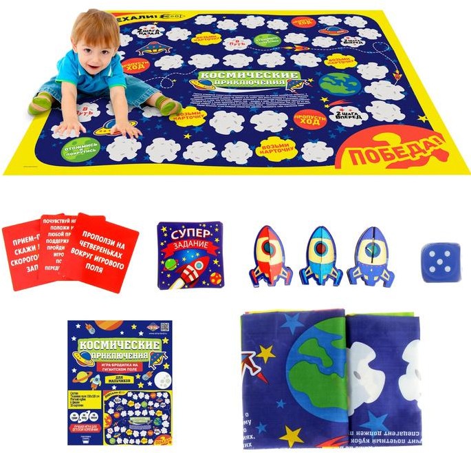Комплектация: Мягкий кубик, тканевое поле 150 х 120 см, 6 фишек, 10 карточек.