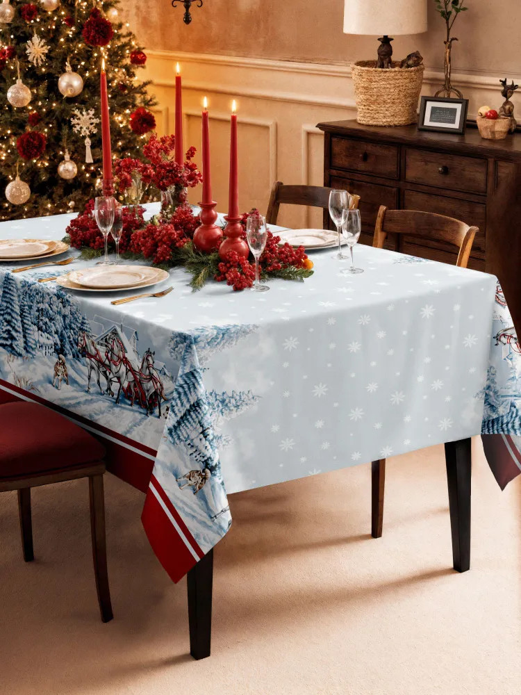 Тканевая скатерть из рогожки (100% хлопок) подарит вам новогоднее настроение! Прямоугольная скатерть надежно защитит поверхность стола от царапин и загрязнений. Плотная скатерть (165 г/м²) из прочной рогожки — лучший выбор для вашего дома: она отлично сохраняет яркий цвет и рисунок благодаря стойким красителям, поэтому долго выглядит, как новая. Стильная скатерть с рисунком зимней деревни подарит праздничное настроение! Голубая скатерть с красными бортиками, заснеженными елочками и санями с лошадьми красиво впишется в интерьер кухни с классическим или современным оформлением. Универсальный сервировочный текстиль создаст у вас дома уют.