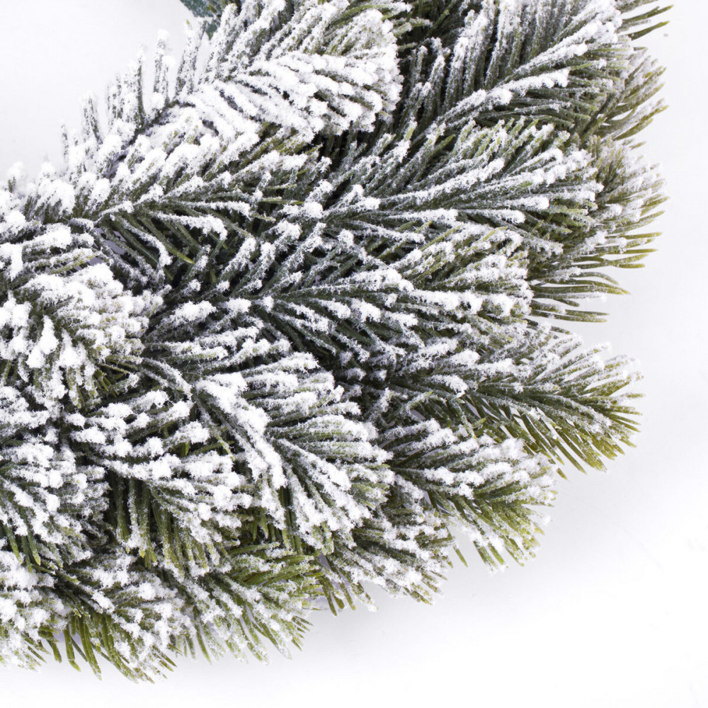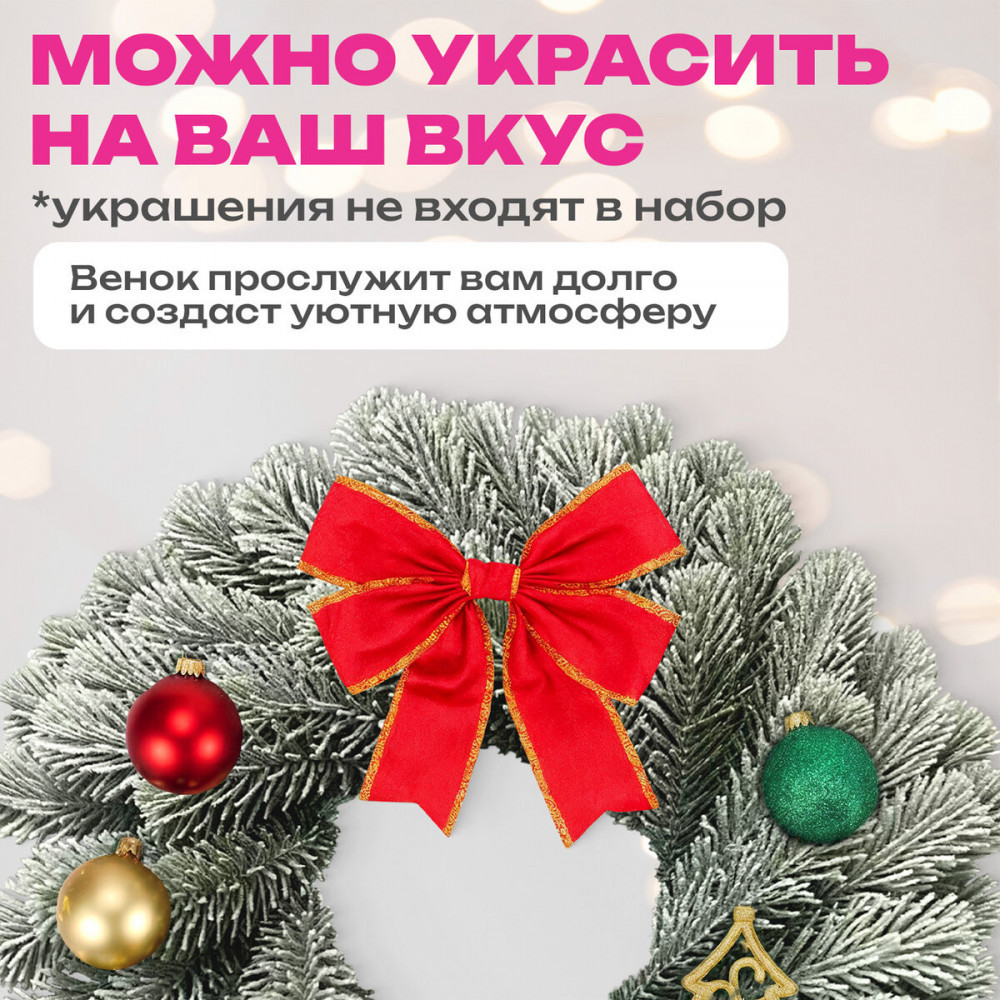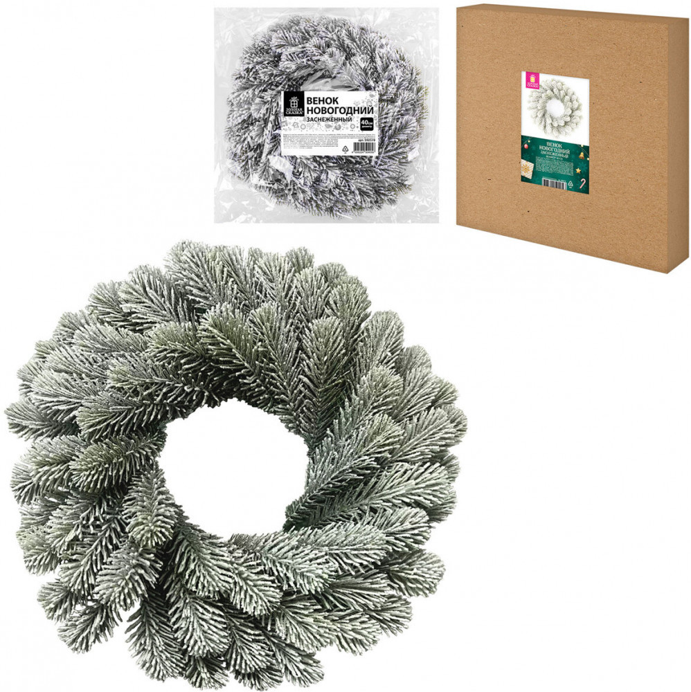 Материал – 100% литой ПЭТ. Цвет хвои – зелёный, заснеженный. Заснеженный венок из литого ПЭТ зеленого цвета выглядит, как натуральный, и создает особую праздничную атмосферу. На задней части основания венка расположено отверстие, за которое можно легко повесить венок на стену или дверь. Можно разместить не только на вертикальную, но и горизонтальную поверхность, сделав частью новогоднего украшения.