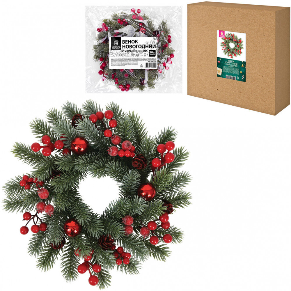 Венок новогодний станет прекрасным украшением для дома или офиса. Венок преобразит пространство и подарит ощущение праздника. Венок новогодний диаметром 30 см представляет собой конструкцию из пластикового каркаса и закрепленных к нему ветвей.