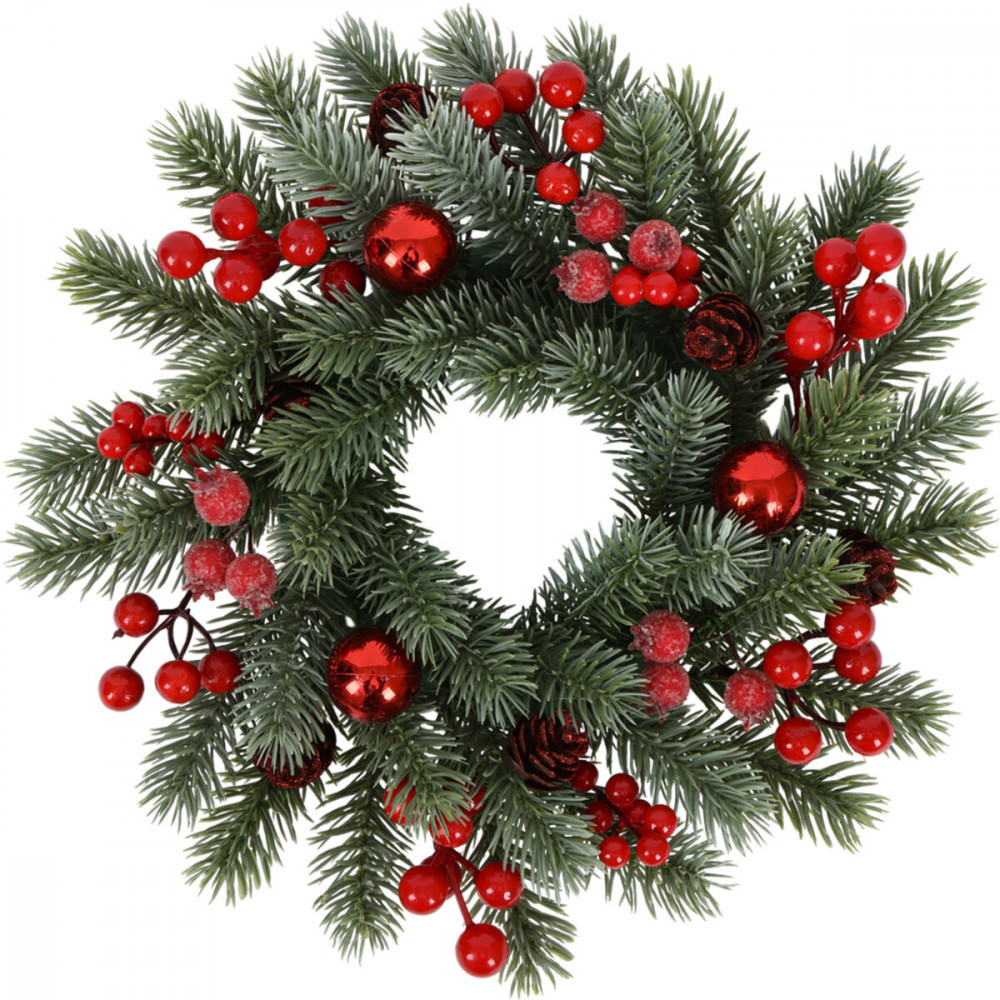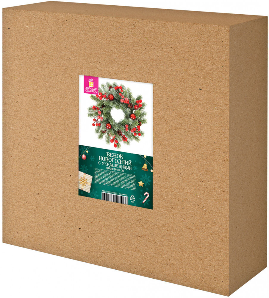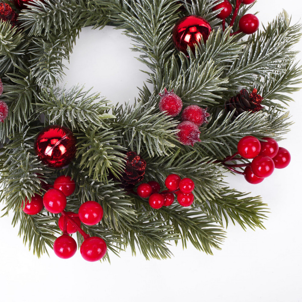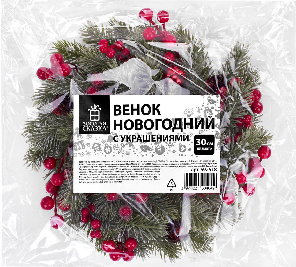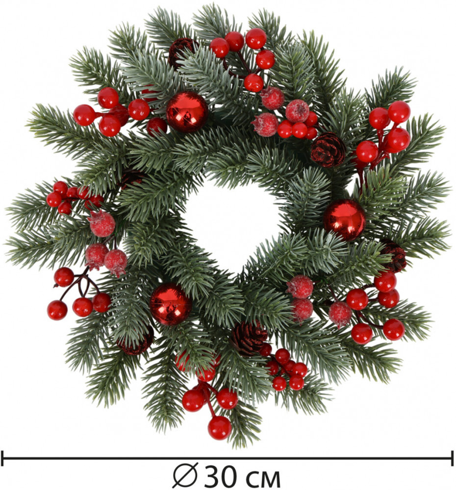 Материал — 100% литой ПЭТ. Цвет хвои — зелёный, заснеженный. Венок из литого ПЭТ украшен ветками красных ягодок, пластиковыми красными шарами и шишками. Венок выглядит, как натуральный, и создает особую праздничную атмосферу. На задней части основания венка расположено отверстие, за которое можно легко повесить венок на стену или дверь. Можно разместить не только на вертикальную, но и на горизонтальную поверхность, сделав частью новогоднего украшения.