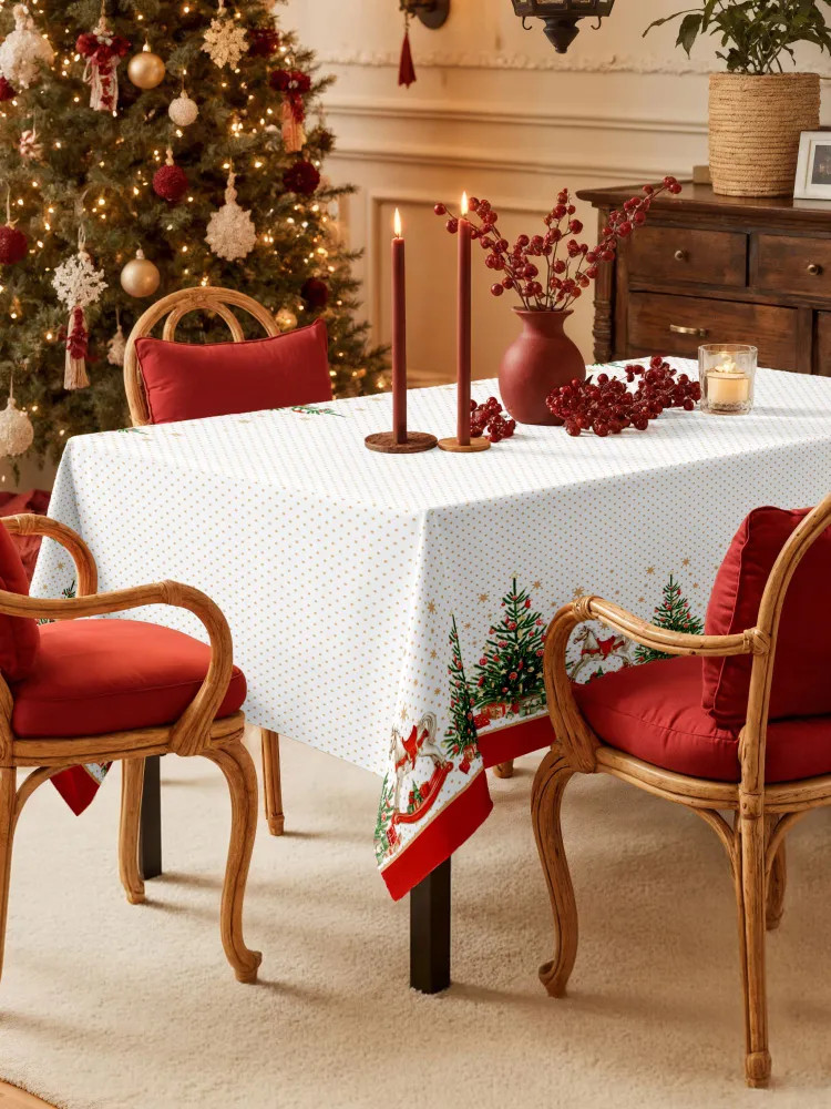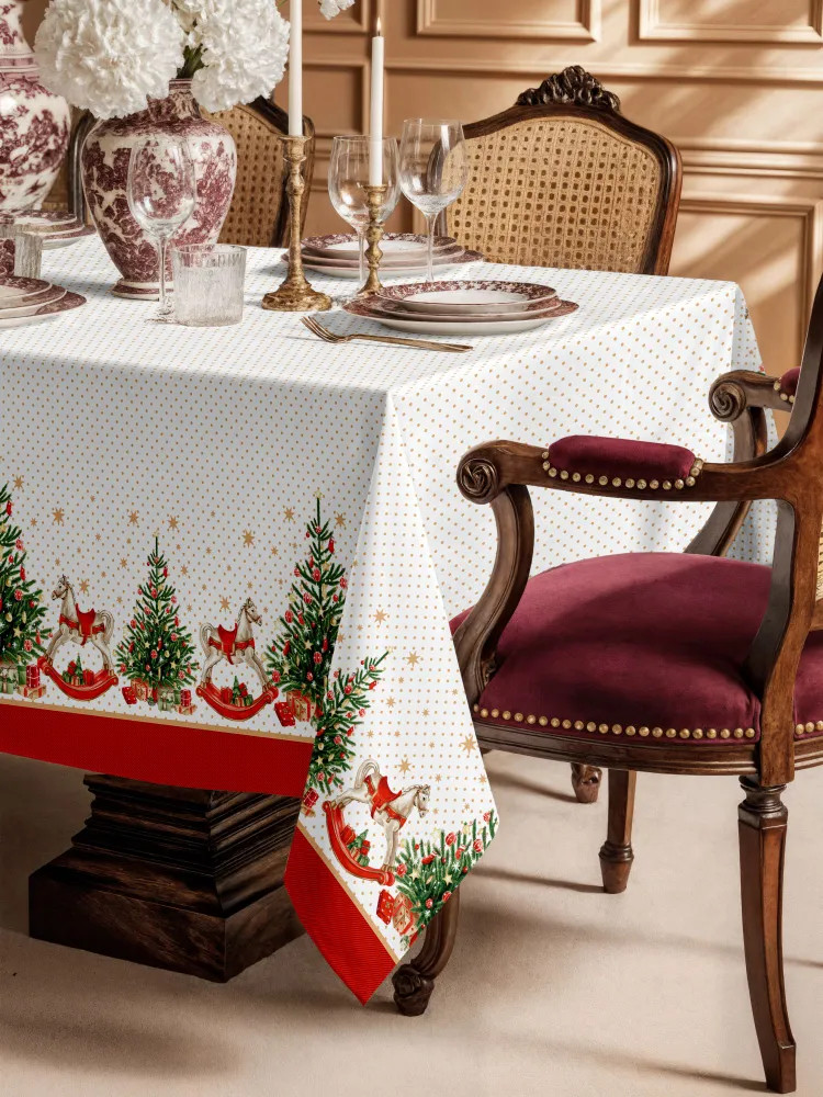 Тканевая скатерть из рогожки (100% хлопок) подарит вам новогоднее настроение! Прямоугольная скатерть надежно защитит поверхность стола от царапин и загрязнений. Плотная скатерть (165 г/м²) из прочной рогожки — лучший выбор для вашего дома: она отлично сохраняет яркий цвет и рисунок благодаря стойким красителям, поэтому долго выглядит как новая. Стильная красно-белая скатерть в горошек красиво дополнит интерьер кухни. Скатерть с красными краями, украшенными елочками, лошадками-качалками и подарками, навеет нежные воспоминания о добром детстве. Универсальный сервировочный текстиль создаст у вас дома уют.
