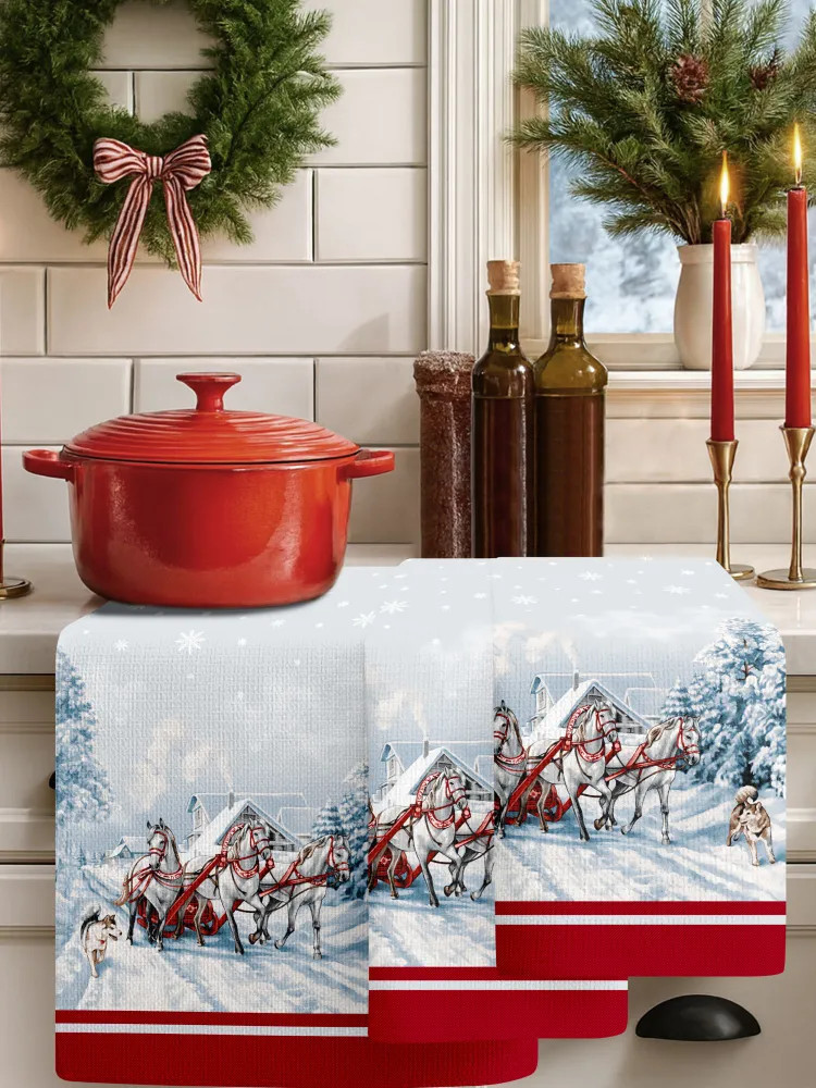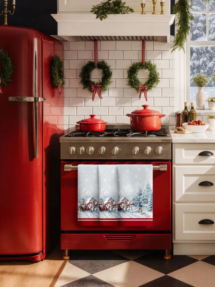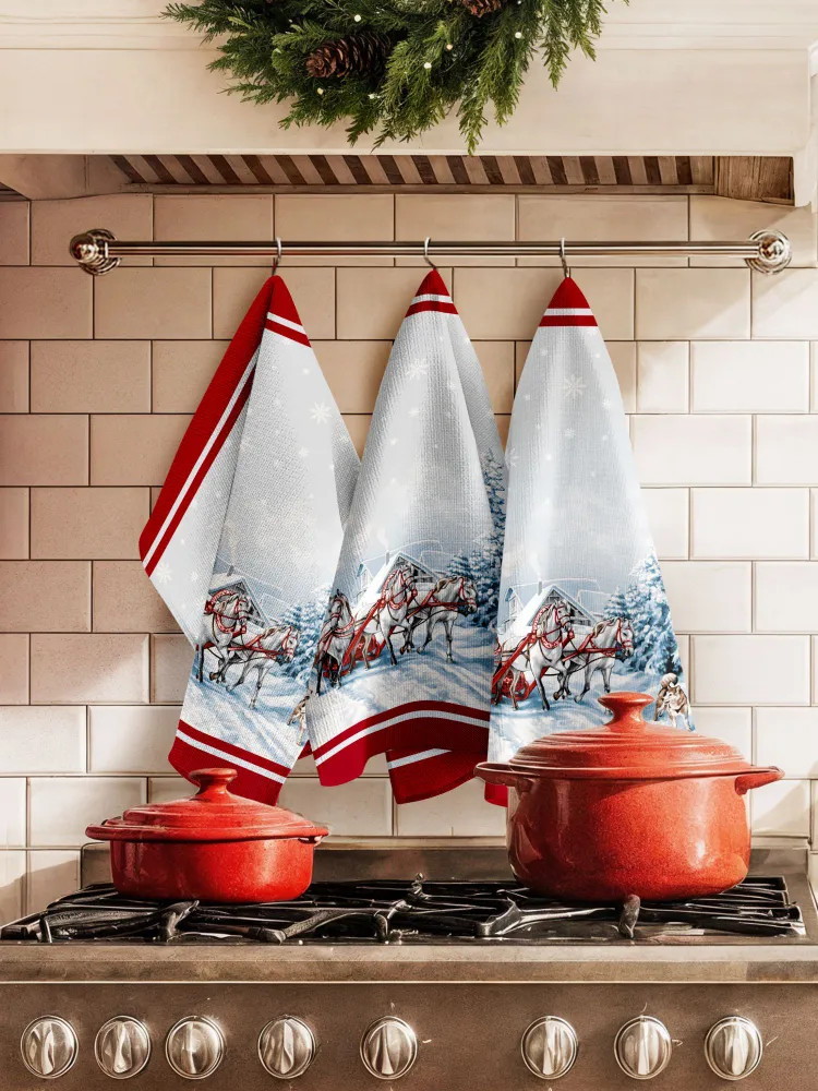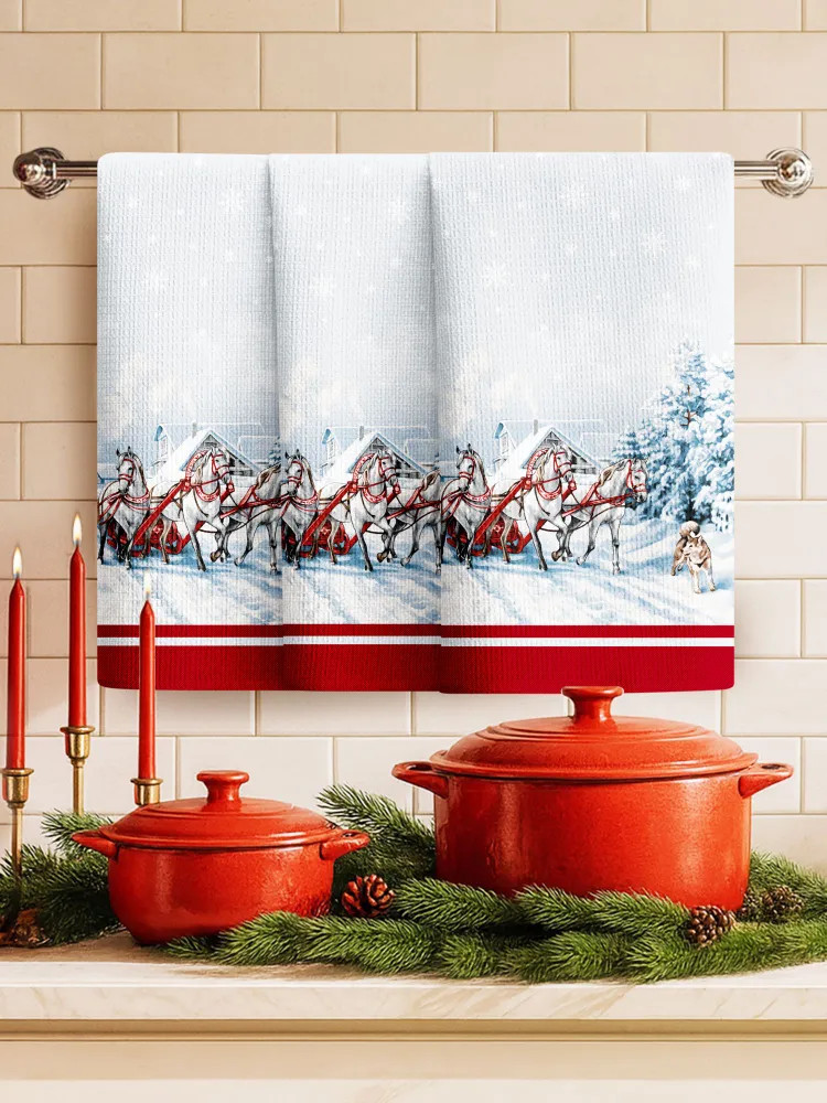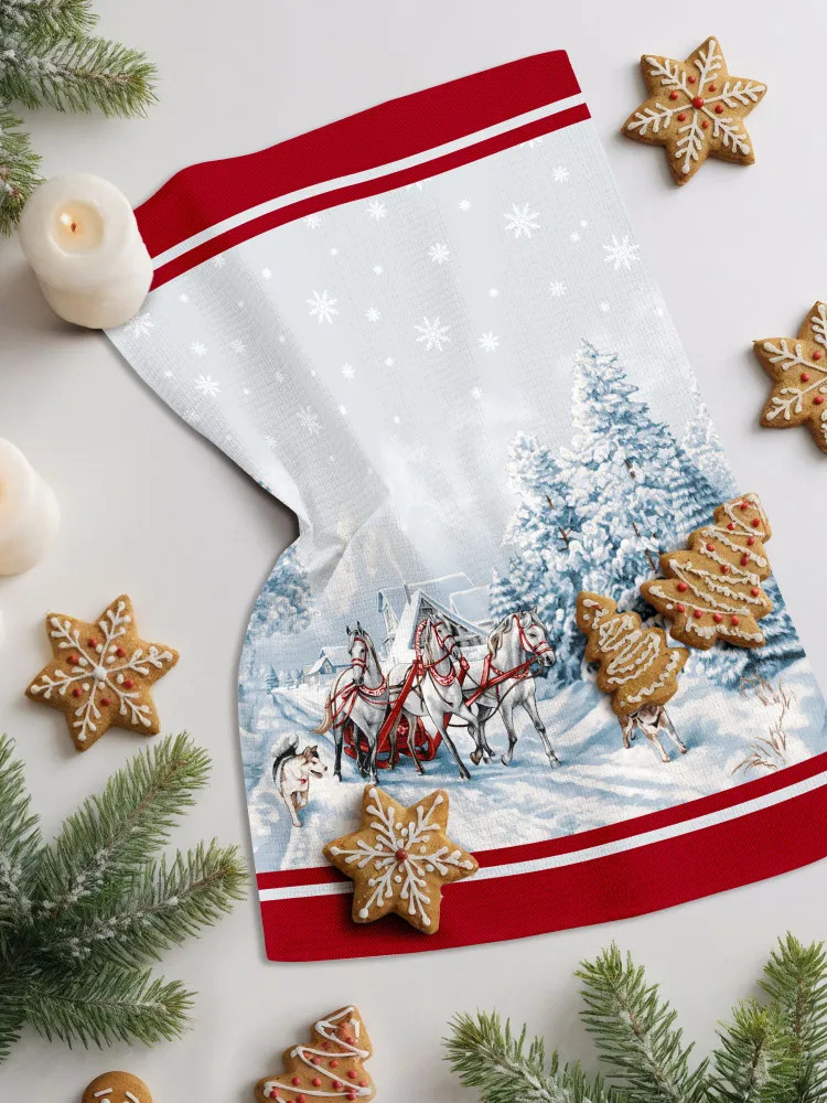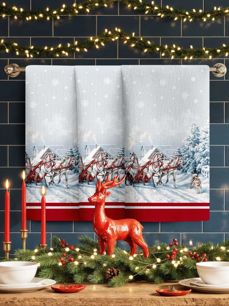 Серия: Three horses Набор из трех рождественских полотенец (рогожка, 100% хлопок) — незаменимая покупка на праздники. Бело-голубые полотенца с красными краями вдохнут в дом новогоднюю атмосферу! Милый принт — зимняя деревня и тройка с лошадьми — символом 2026 года — позволит им эстетично смотреться в столовой вне зависимости от того, в каком стиле оформлена комната. Такой домашний текстиль создаст в доме уют и станет ярким акцентом в интерьере. Кухонные полотенца из натуральной, мягкой и износоустойчивой ткани подходят для ежедневного использования: они будут полезны во время готовки и других хозяйственных дел. Прочные тканевые полотенца плотностью 165 г/м2 быстро сохнут, а их способность долго сохранять цвет и рисунок — настоящий подарок. Они также не оставляют следов ворса на твердой поверхности. Комплект состоит из трех одинаковых хлопковых полотенчиков (45×60 см). Прямоугольными полотенцами легко вытереть руки, а еще их можно положить под посуду у раковины или использовать во время уборки стола. |