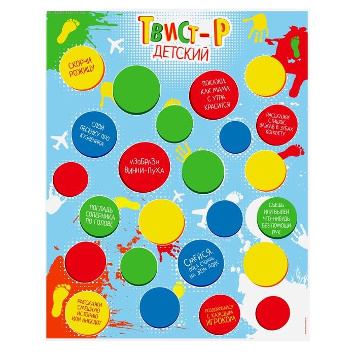 Для начала расстелите игровое поле и выберите ведущего. Пусть он вращает рулетку и объявляет цвет круга, в который нужно поместить часть тела. А теперь самое интересное! В некоторых кружочках написано веселое задание. Когда свободных точек не останется, вам нужно будет не только удержать равновесие, но и «показывать, как мама красится» или «изображать Винни-Пуха». Проявляйте чудеса гибкости и импровизации всей семьей или в компании друзей!