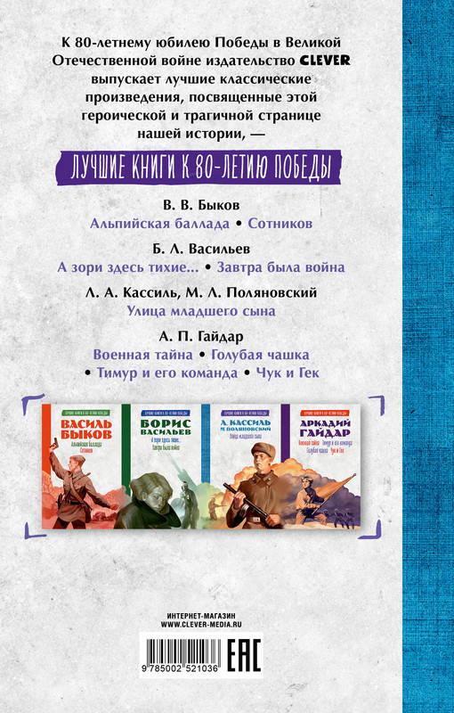 Повесть Льва Кассиля и Макса Поляновского — прекрасный подарок для дочки, сына, внука или внучки ко Дню Победы (9 Мая), 23 февраля, на день рождения (ДР), Новый год (НГ) или любой другой праздник. Можно подарить ее отдельно или дополнить праздничный набор или подарочный комплект исторической, приключенческой художественной литературы для мальчиков и девочек. Коллекционное издание книги «Улица младшего сына» оценят родители, которые выбирают для своих детей классику, рассказы и повести о школьниках, любимые произведения, поэзию и прозу от таких издательств, как «АСТ», «Эксмо», «Альпина», Clever («Клевер»), «Росмэн», «Феникс-Премьер», «Счастье внутри». |