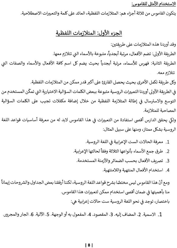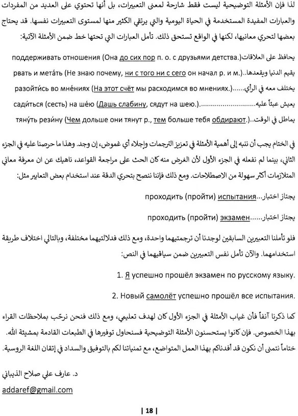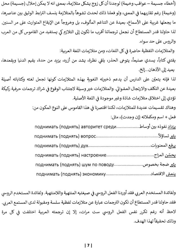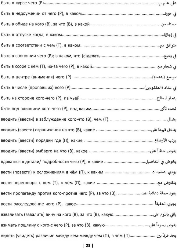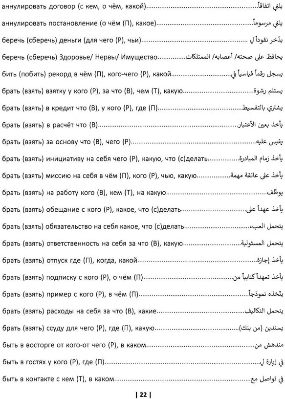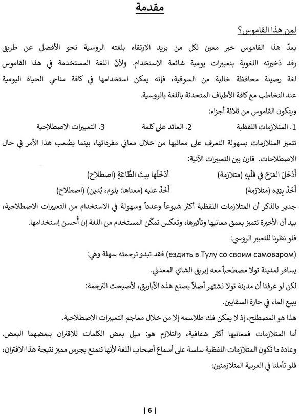Настоящий словарь является первым в своем роде фразовым справочником, предназначенным для арабских пользователей, желающих расширить свой словарный запас, пополняя его фразами, используемыми в русском языке. Словарь может также представлять интерес для русскоговорящих, интересующихся арабской фразеологией, поскольку в переводе были подобраны самые сочетаемые арабские фразы. Словарь состоит из двух частей: первая часть представляет собой глагольно-именные устойчивые словосочетания с грамматическими характеристиками, определяющими их валентность. Вторая часть включает в себя самые известные идиомы русского языка с иллюстративными примерами и переводом на арабский язык. |