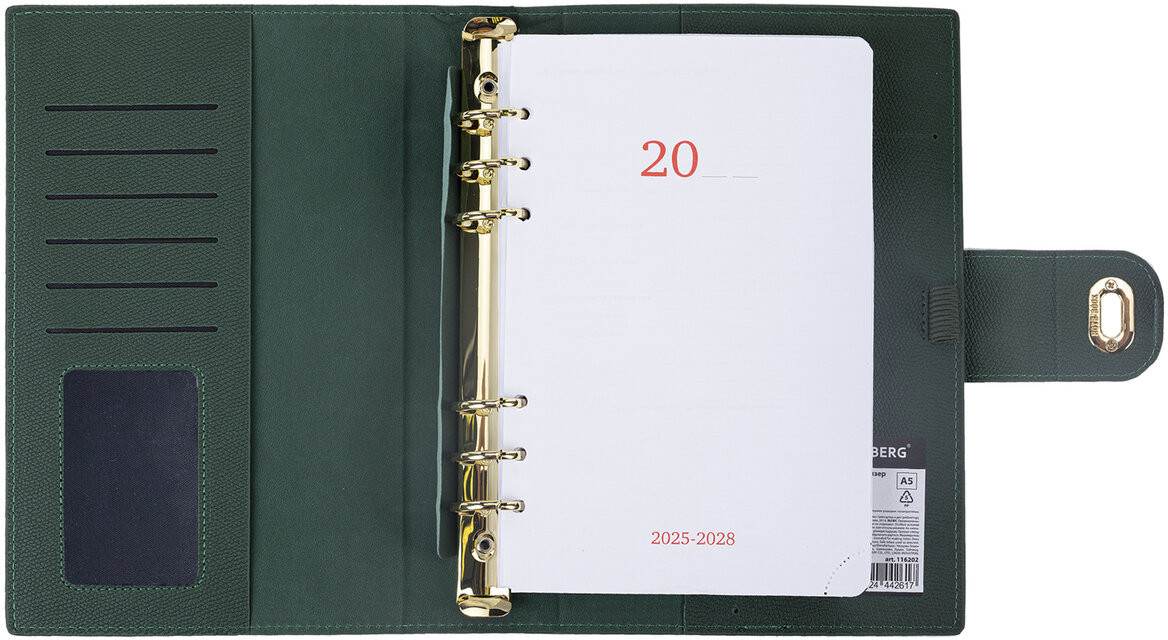 Недатированный ежедневник-органайзер Brauberg «Nova» выполнен в оригинальном стиле. Сочетает в себе удобство ежедневника и функциональность органайзера. Твердая обложка с кольцевым механизмом оснащена дополнительными карманами для хранения бумаг, карточек и мелочей. Съемный внутренний блок включает 160 листов белой бумаги плотностью 70 г/м2. Благодаря формату B5 (167×240 мм) ежедневник удобно использовать как в офисе, так и на выездных деловых встречах. |
