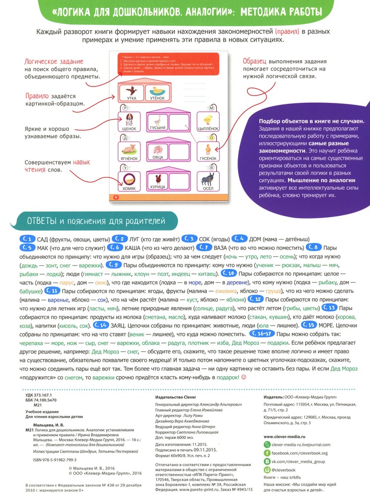 • Книга содержит специальный гид для родителей, что позволяет легко ориентироваться в заданиях и правильно подавать информацию ребенку.