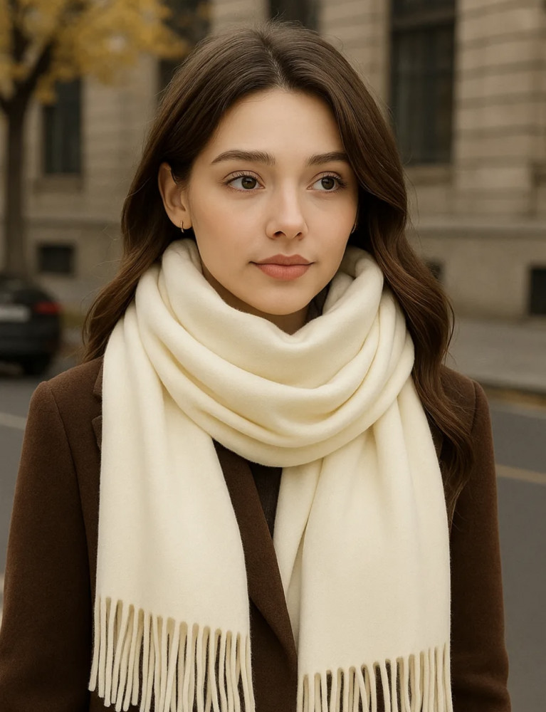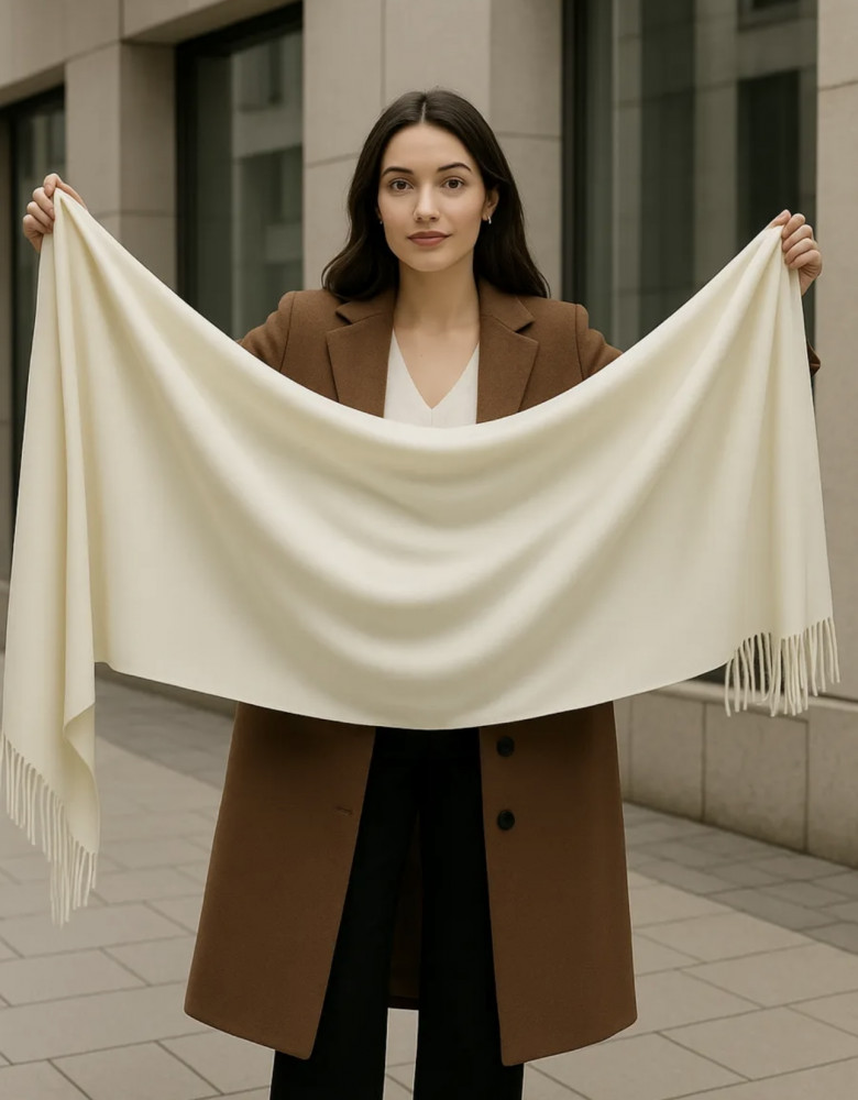 Элегантный палантин в оттенке слоновой кости — воплощение роскоши и минимализма. Мягкий, тёплый и благородный, он станет идеальным акцентом в вашем образе в любое время года. Благодаря продуманному размеру 175×70 см, палантин легко драпируется, красиво лежит на плечах и подходит как для повседневных, так и вечерних образов.