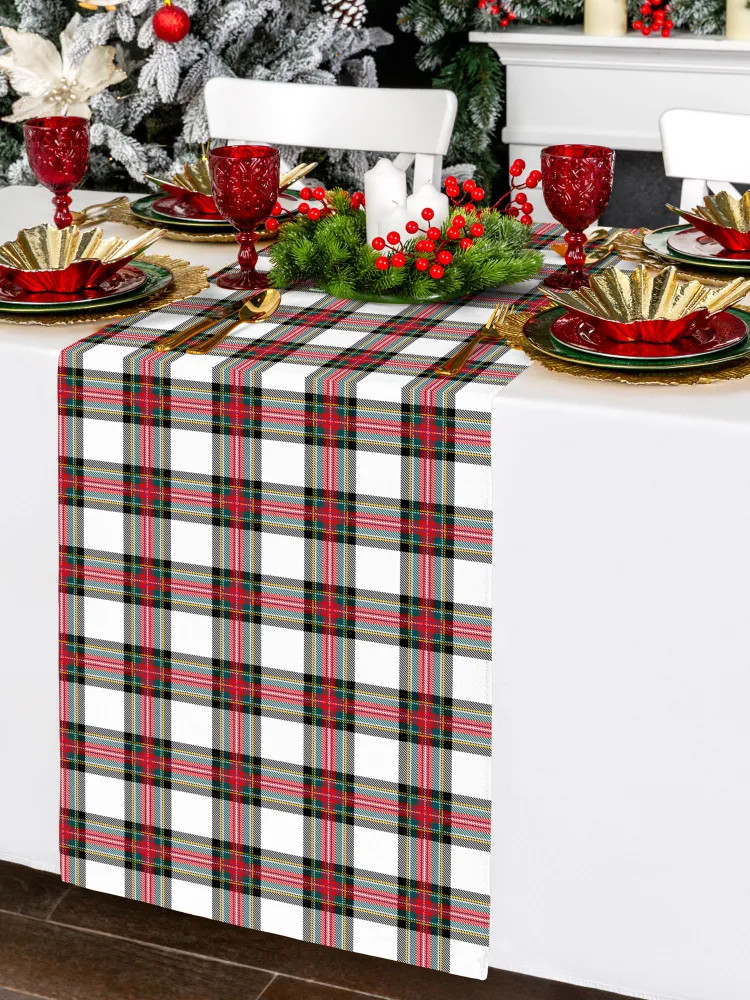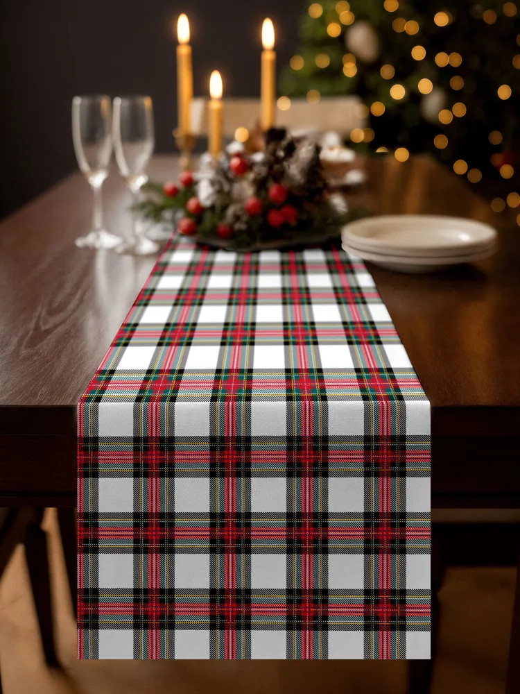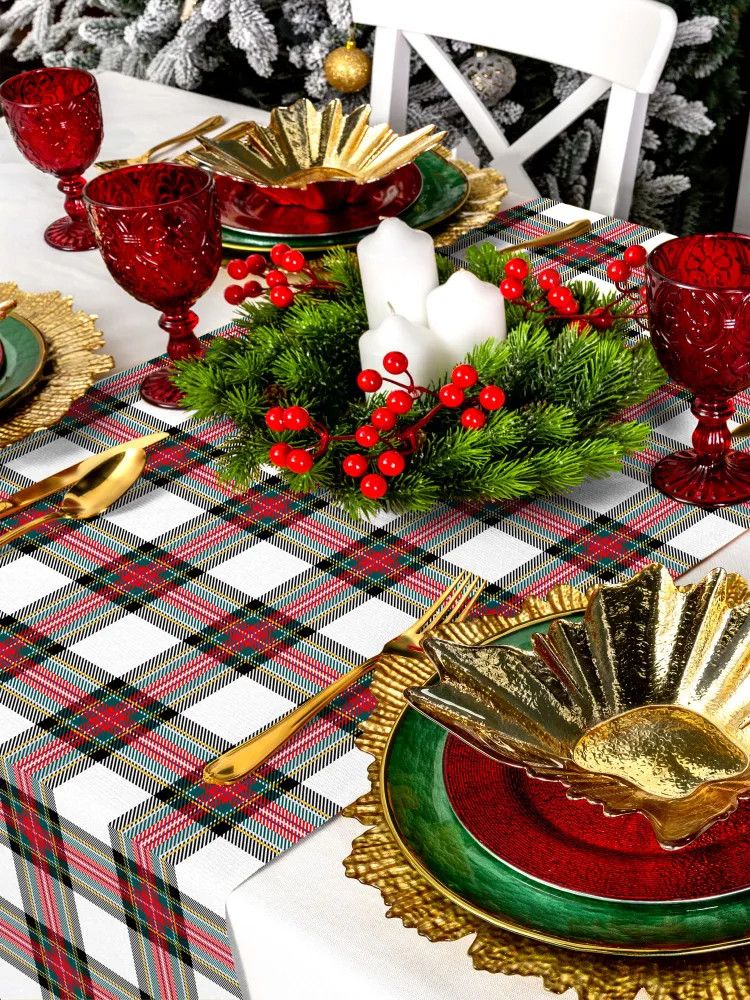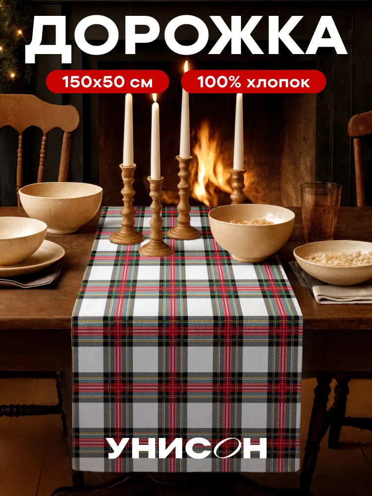 Новогодняя скатерть-дорожка из рогожки (100% хлопок) украсит собой праздничный стол, защитив его от царапин и других повреждений. Длинная прямоугольная скатерть — современный вариант сервировки рождественского стола. Скатерть из хлопчатобумажной, неприхотливой в уходе ткани сделает кухню по-настоящему стильной. Скатерть с традиционным рисунком — белой шотландской клеткой — создаст дома уют. Цветная дорожка с контрастным повторяющимся принтом станет идеальным дополнением праздничного стола.