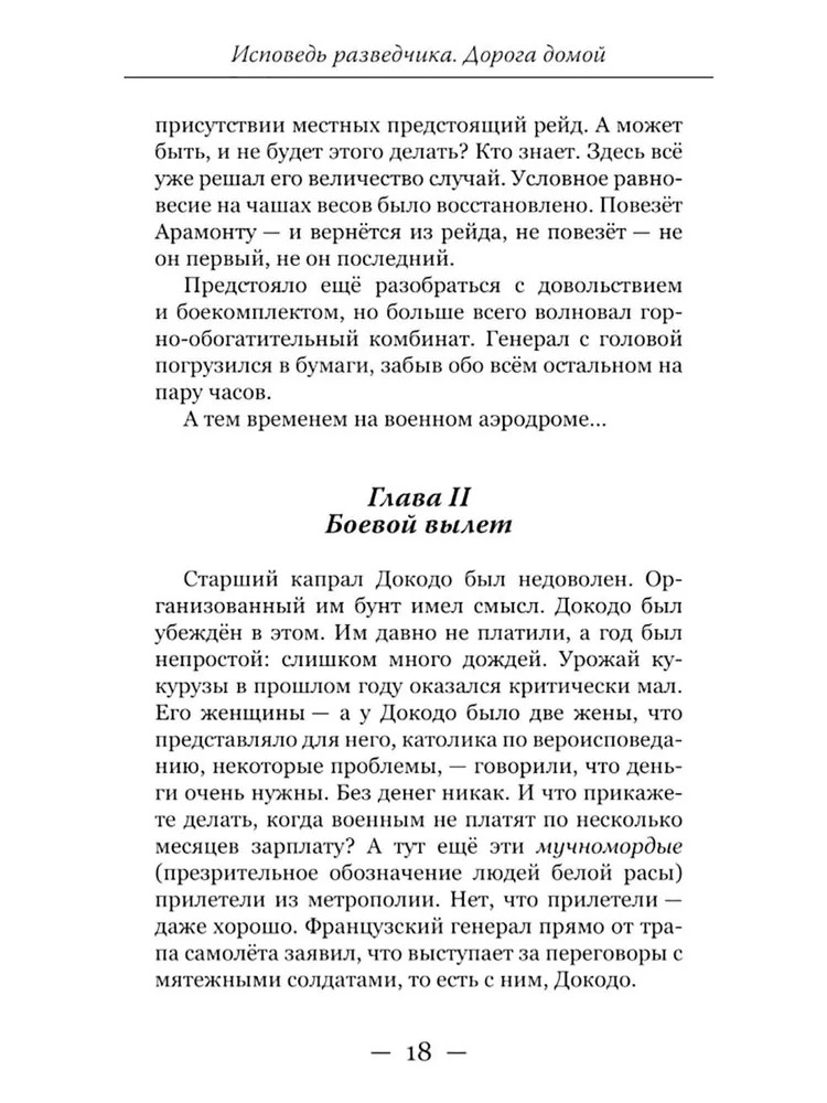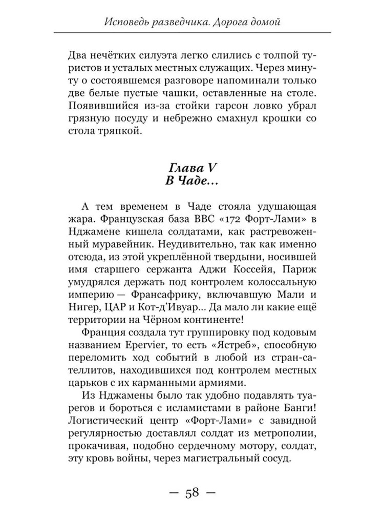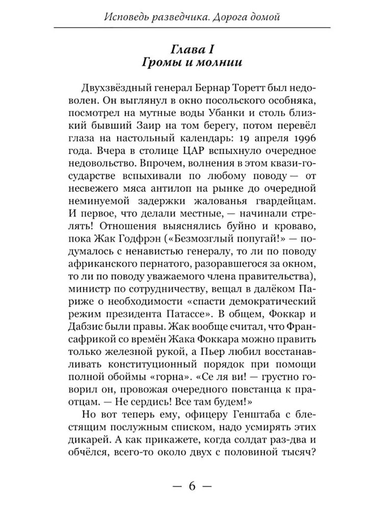 Данная книга — уже вторая в цикле «Исповедь разведчика» (первая — «Исповедь разведчика. Без права на возвращение», 2023 г.) —продолжает рассказ о непростом пути Алекса-Андре д’Арамонта, русского разведчика, по долгу службы оказывающегося в разных точках земного шара: во Франции, Италии, странах Африканского континента. Читатель имеет возможность увидеть мир разведки изнутри, глазами профессионала, живущего в чужой стране под вымышленным именем, участвующего в опасных операциях, балансирующего на грани провала и мечтающего вернуться на родину.