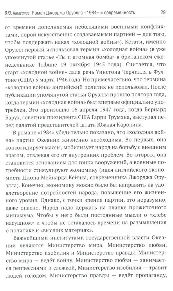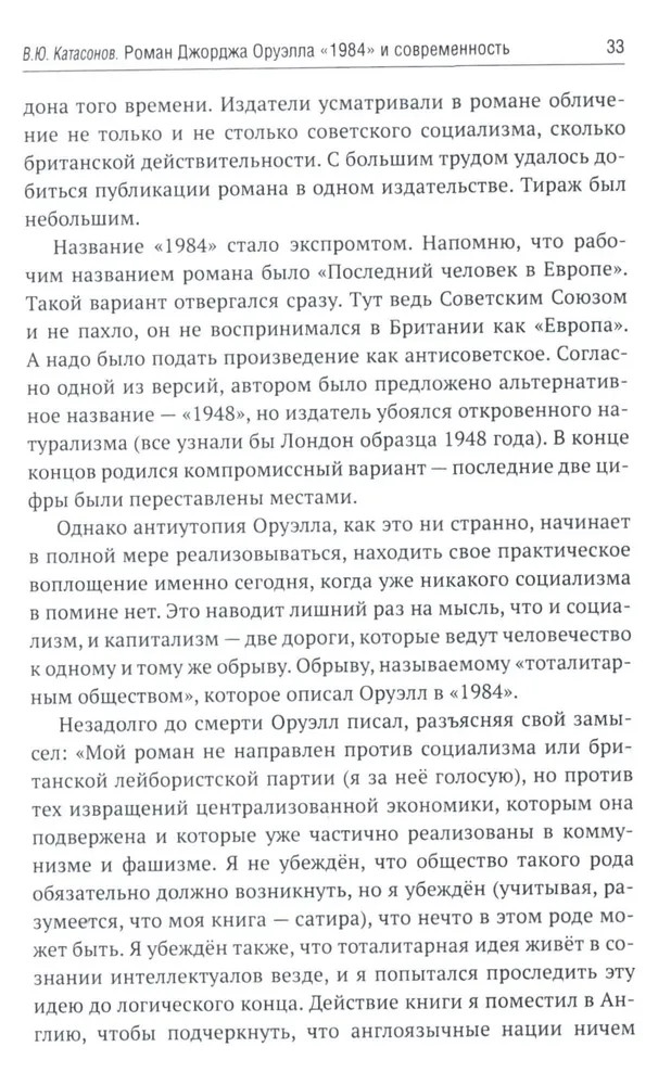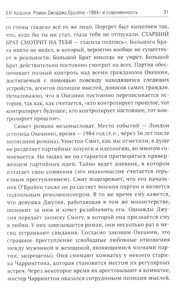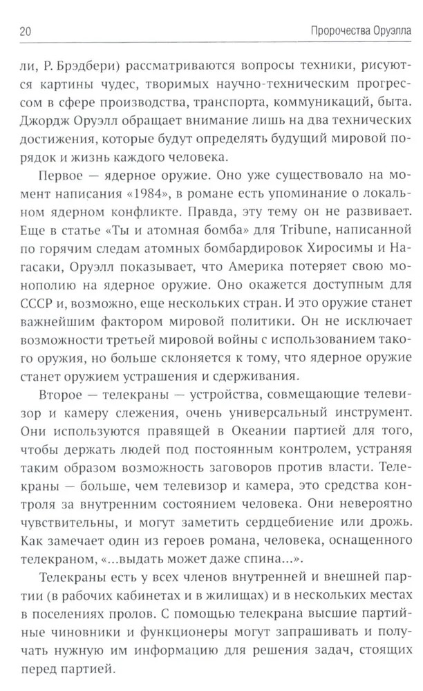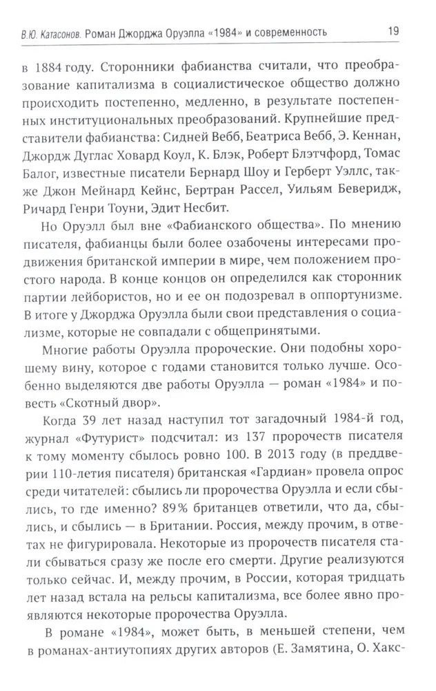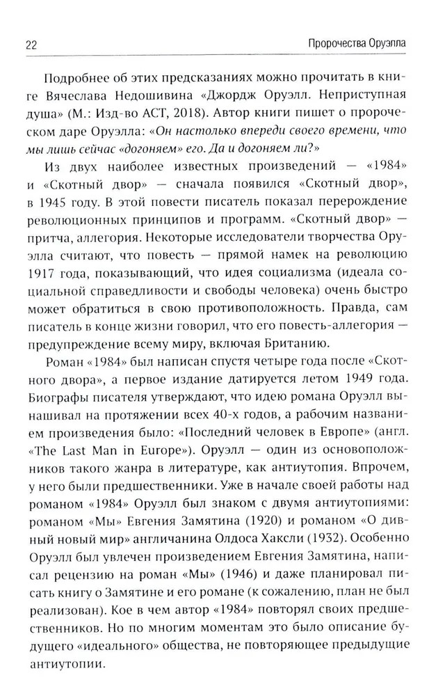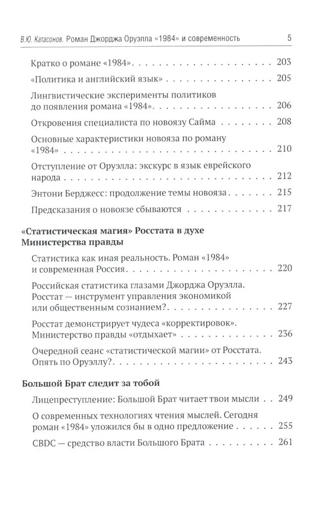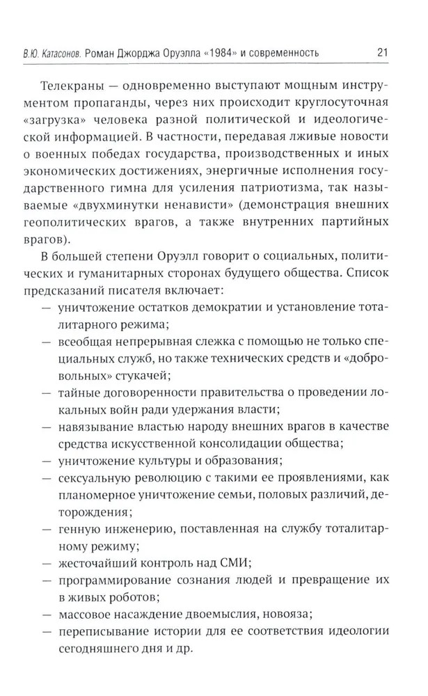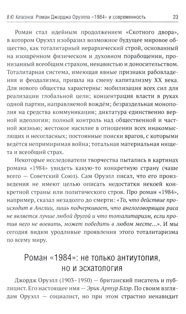 В 1949 году вышел в свет роман Дж. Оруэлла «1984», который казался современникам далеким от реальности, почти фантастическим. Но по прошествии 75-лет можно с уверенностью утверждать, что писатель каким-то мистическим образом предугадал развитие событий в мире и антиутопия стала прозой жизни XXI-века. Данная книга представляет собой сборник статей В. Ю. Катасонова, публициста и экономиста, посвященных пророческому роману «1984». Здесь можно встретить предсказания, которые уже сбылись или начинают сбываться в наше время, познакомиться с основными догматами и антропологией тоталитарного государства, вспомнить о кризисе современной науки и уничтожении классической литературы, поразмышлять об изменении человеческого сознания и поведения с помощью предельного упрощения языка, узнать о современных технологиях слежения за человеком (даже за его мыслями). Актуальность вопросов, волновавших людей в середине XX-века, подтверждают события последних десятилетий в России и мире. |