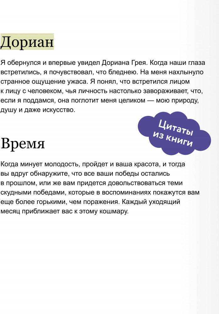 Серия: Вечные истории. Иллюстрированная классика Young Adult Юный Дориан Грей мечтает навсегда остаться молодым и прекрасным — и теперь вместо Дориана стареет его портрет. Вот только в погоне за удовольствиями юный Дориан теряет голову и погружается в бездну низменных страстей. Но время все расставит по местам... Эта история о красоте и соблазне, о цене, которую приходится платить за мимолетные удовольствия. Вопросы, которые затрагивает Оскар Уайльд, и сегодня не теряют своей остроты: что важнее — внешность или внутренняя сущность, и можно ли спрятаться от последствий собственных поступков? |