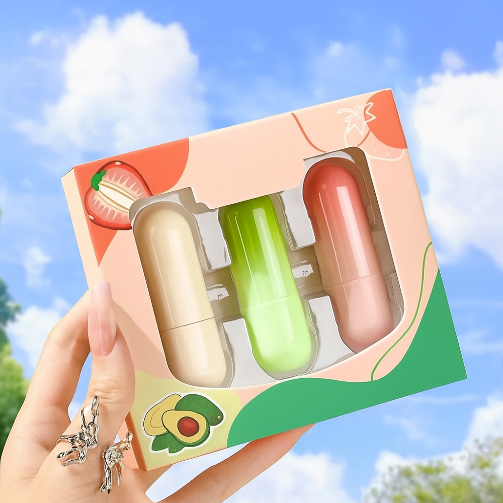 Набор увлажняющих бальзамов для губ с ароматами клубники, авокадо и мяты