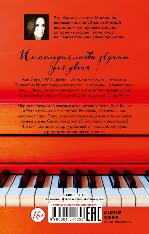 Серия: Романы Эми Хармон Новинка от королевы сентиментальной прозы и автора бестселлеров «О чем знает ветер» и «Из песка и пепла». Это история любви музыканта и певицы, поставивших на карту все, чтобы быть вместе. Нью-Йорк, 1960. Для Бенни Ламента музыка — это жизнь. Пианист из Бронкса держится подальше от темных делишек своей семьи. Он пишет песни для других музыкантов и предпочитает оставаться в тени... пока однажды не встречает Эстер Майн. Перед голосом этой девушки невозможно устоять. Дуэт Бенни и Эстер гремит на всю страну. Его песни, ее вокал — они идеальная пара. Пара, которую готовы видеть вместе на сцене, но не в жизни. Слава или страсть? Счастье или творчество? Что они поставят на карту ради любви, когда обоим будет угрожать смертельная опасность? |