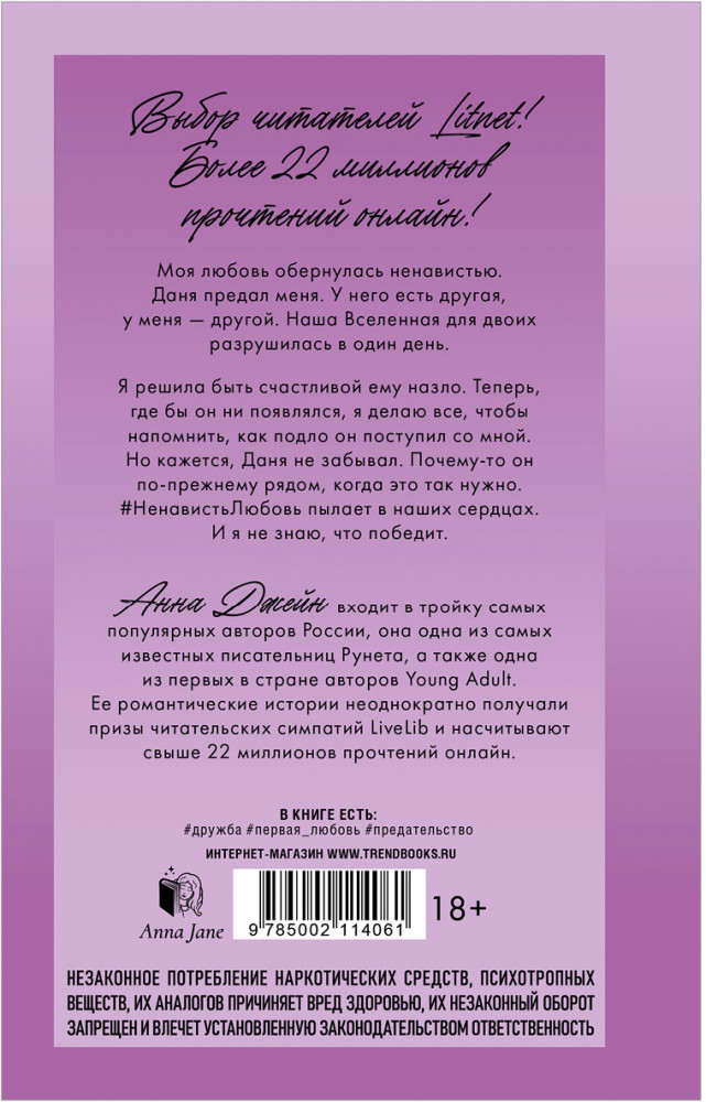Новое оформление любимого романа Анны Джейн! Хит серии #trendbooks. «#НенавистьЛюбовь» — это долгожданное продолжение нашумевшего бестселлера «#ЛюбовьНенависть». Моя любовь обернулась ненавистью. Даня предал меня. У него есть другая, у меня — другой. Наша Вселенная для двоих разрушилась в один день. Я решила быть счастливой ему назло. Теперь, где бы он ни появлялся, я делаю все, чтобы напомнить, как подло он поступил со мной. Но кажется, Даня не забывал. Почему‑то он по‑прежнему рядом, когда это так нужно. #НенавистьЛюбовь пылает в наших сердцах. И я не знаю, что победит.