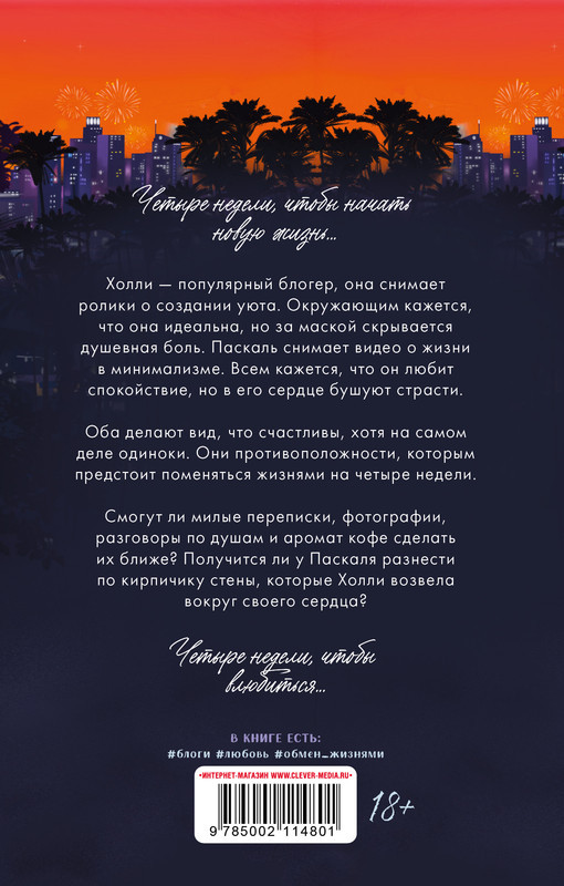 Серия: #trendbooks Он как темная звездная ночь. Она как рассвет, наполненный золотыми красками. Уютная история, с которой не захочется расставаться, история, наполненная путешествиями, долгими разговорами и ароматом кофе. Холли — популярный блогер, она снимает ролики о создании уюта. Окружающим кажется, что она идеальна, но за маской скрывается душевная боль. Паскаль снимает видео о жизни в минимализме. Все уверены, что он любит спокойствие, но в его сердце бушуют страсти. Оба делают вид, что счастливы, хотя на самом деле одиноки. Они противоположности, которым предстоит поменяться жизнями на четыре недели. Смогут ли милые переписки, фотографии, разговоры по душам и аромат кофе сделать их ближе? Получится ли у Паскаля разнести по кирпичику стены, которые Холли возвела вокруг своего сердца? Четыре недели, чтобы начать новую жизнь... Четыре недели, чтобы влюбиться... «Жизнь по обмену» — роман о доверии и о том, что иногда нужно кардинально поменять жизнь, чтобы найти свое счастье. |