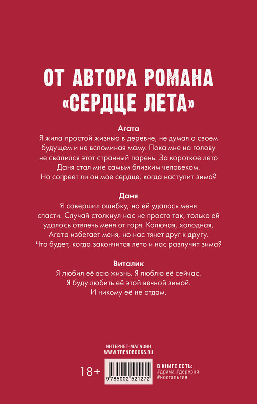 Серия: #Trendbooks_love «Сердце зимы» — захватывающий и трепетный роман Хелены Хейл. История первой любви, взаимного притяжения и сложных семейных отношений от автора бестселлеров «Сердце лета», «Холодный кофе, или Одиночество Офелии Коулман», «Лавандовая ветвь». В нежном оформлении редакции Trendbooks.